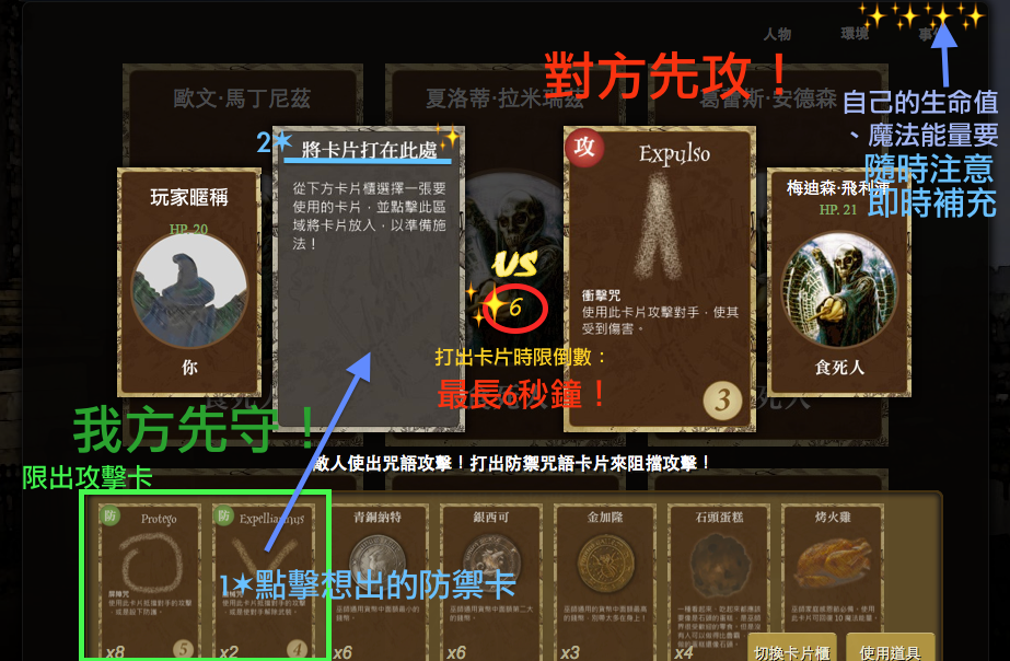 身上的道具清點:藥水、咒語卡(攻擊、防禦、冒險!)