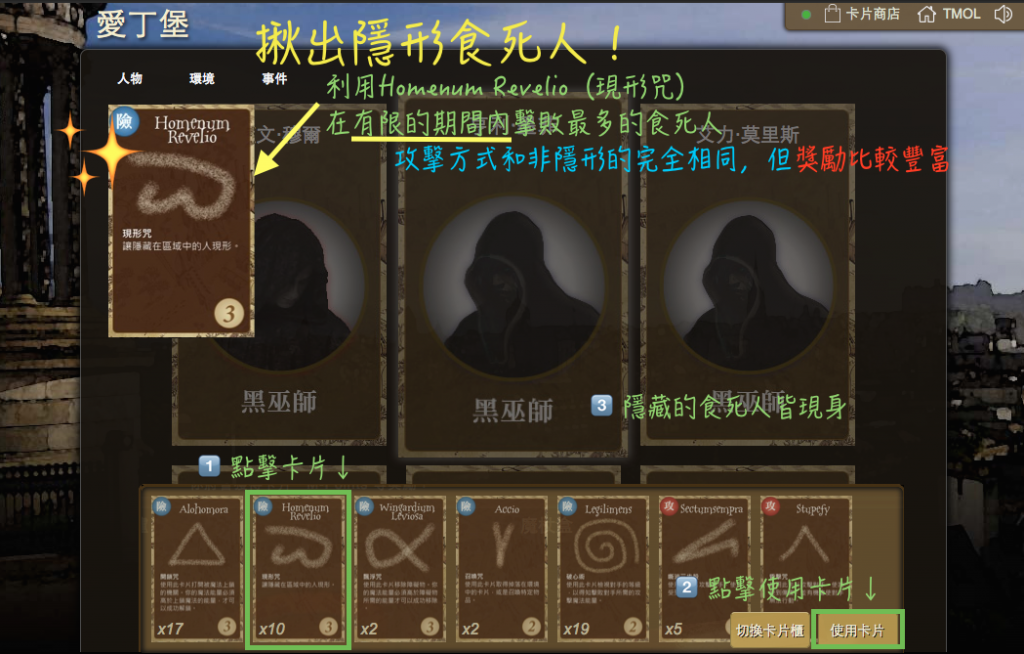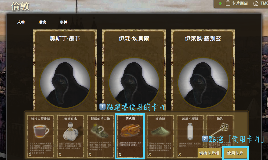 ♣打出攻擊、防禦、冒險型卡片,使用道具卡的方式