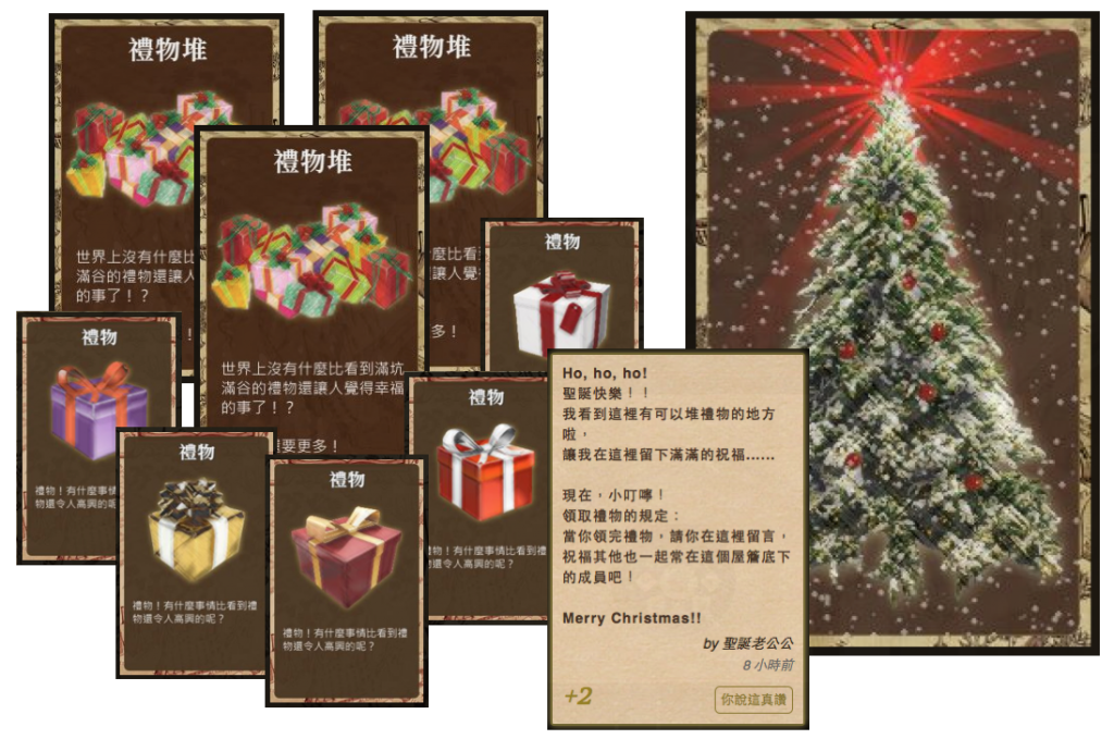 先祝大家 Merry Christmas😊 社團總部出現禮物堆了耶😲 趕快去「翻一翻」就可以拿到禮物了😀 (這樣擺就像禮物堆在聖誕樹下了🤭) 還有,大家不要忘記聖誕老公公有留言喔^^ 要記得遵守聖誕老公公的指示唷😉 不遵守明年不知道會不會就收不到禮物了😜 還有還有,發現聖誕老公公本人啦!! 😘 立過聖誕樹以後快去找他 (小聖誕說在有煙囪的地方) 會有更好康的喔😃 再祝一次大家聖誕快樂啦✌ 1