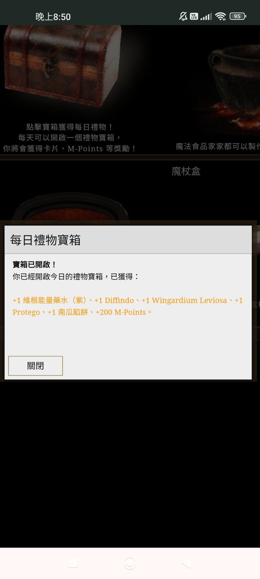 +1 維根能量藥水 (藍) 、 +1 Expeliarmus 、+1 Wingardium Leviosa 、 +1 Accio 、 +50 M-Points