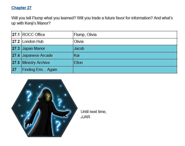 而在21章跟雅各最後談完後22章回到了奧莉維亞身邊並告訴雅各他知道自己的錯誤,並當時從雅各口中得知還需要時間調查,總之這章雅各知道信封紙的製造地點在一座達崎伊隆家族的豪宅,而主角跟雅各前往豪宅被滅幻咒擋住,解咒進入後被其家族成員達崎健二發現。