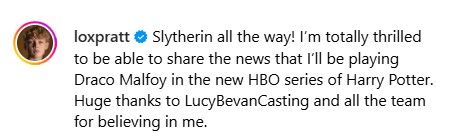 即將在影集中飾演跩哥・馬份的洛克斯・普萊特 (Lox Pratt) 在其個人社媒平台上po文與大家分享自己的興奮心情,並感謝選角導演與團隊的信任。 他在限時動態中也轉發了官宣的文章。 一起來期待新版跩哥吧! 8