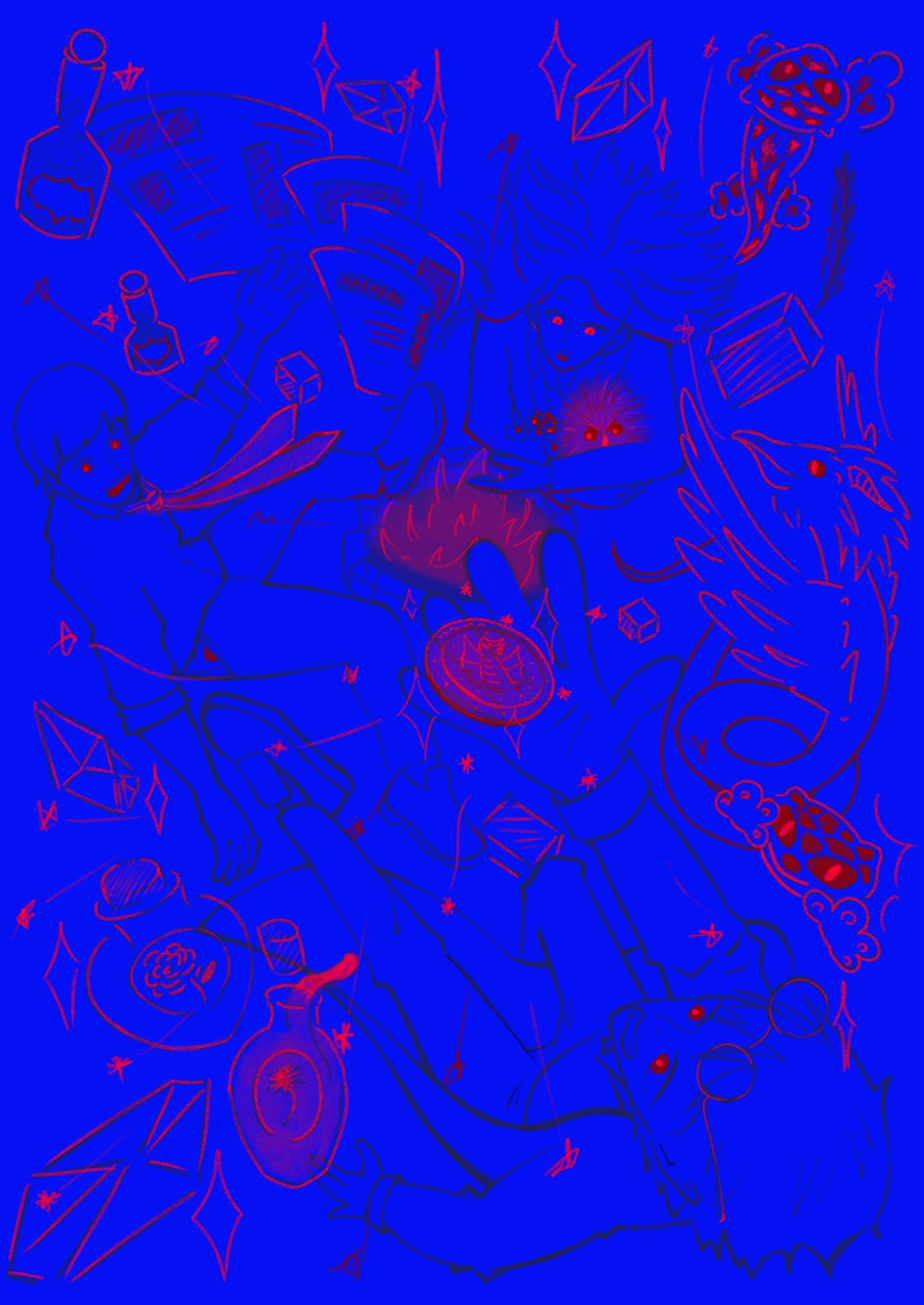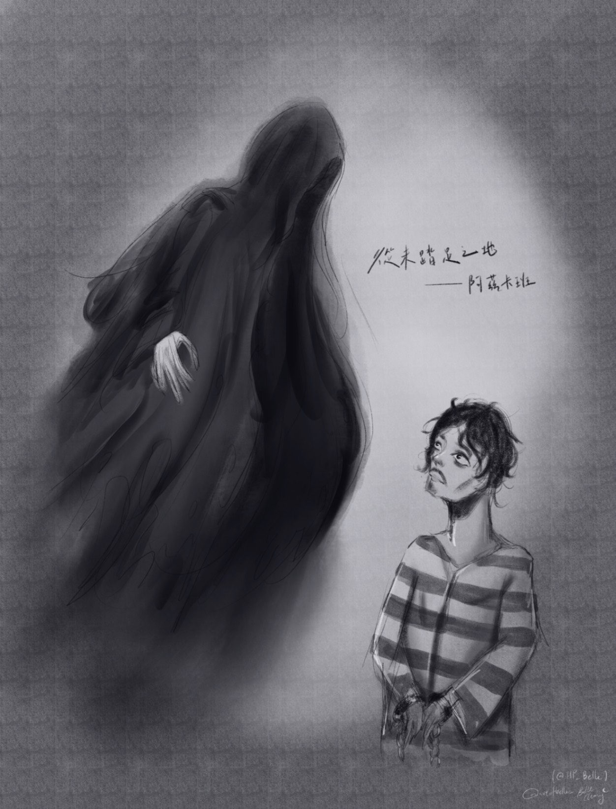 看到畫的時候,真的有驚豔到,畫裡濃濃的壓迫感,眼睛和斗篷構成如漩渦般的深淵,讓我再次回到故事中。我最喜歡的是無數顆眼睛的部分,像是一個過度自省的創作者,覺得無時無刻都有人在盯著自己,挑剔作品問題。整幅作品唯一的顏色在於赫伯特,又以羊皮紙的顏色最為顯眼,而且仔細看,彷彿有光微微散發出來,像是寫作對於赫伯特是如同太陽般的存在,既溫暖又能驅散苦悶生活的黑暗,然而對比結局沉溺在虛假的光之中,不免唏噓不已。真的是很好濃縮故事的一幅畫,。゚ヽ(゚´Д`)ノ゚。 超棒的,收下我的膝蓋吧!