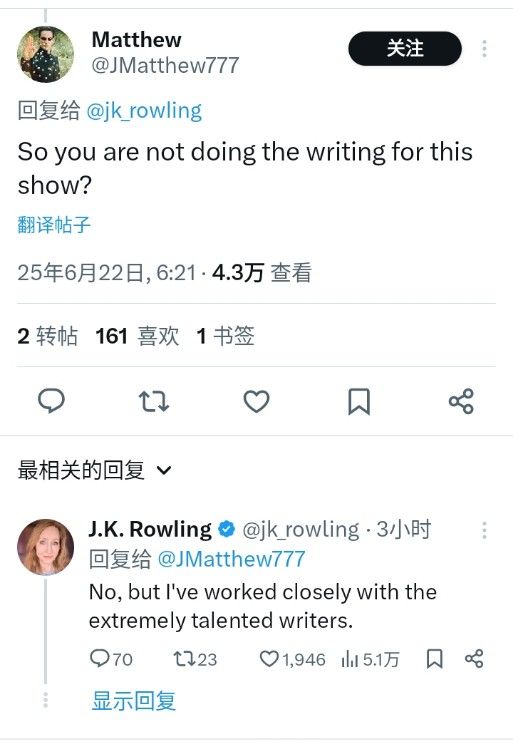 羅琳在X平台(原推特)上分享她看過HBO哈利波特系列影集前兩集劇本後的心情,她表示真的是特別、特別、特別好!