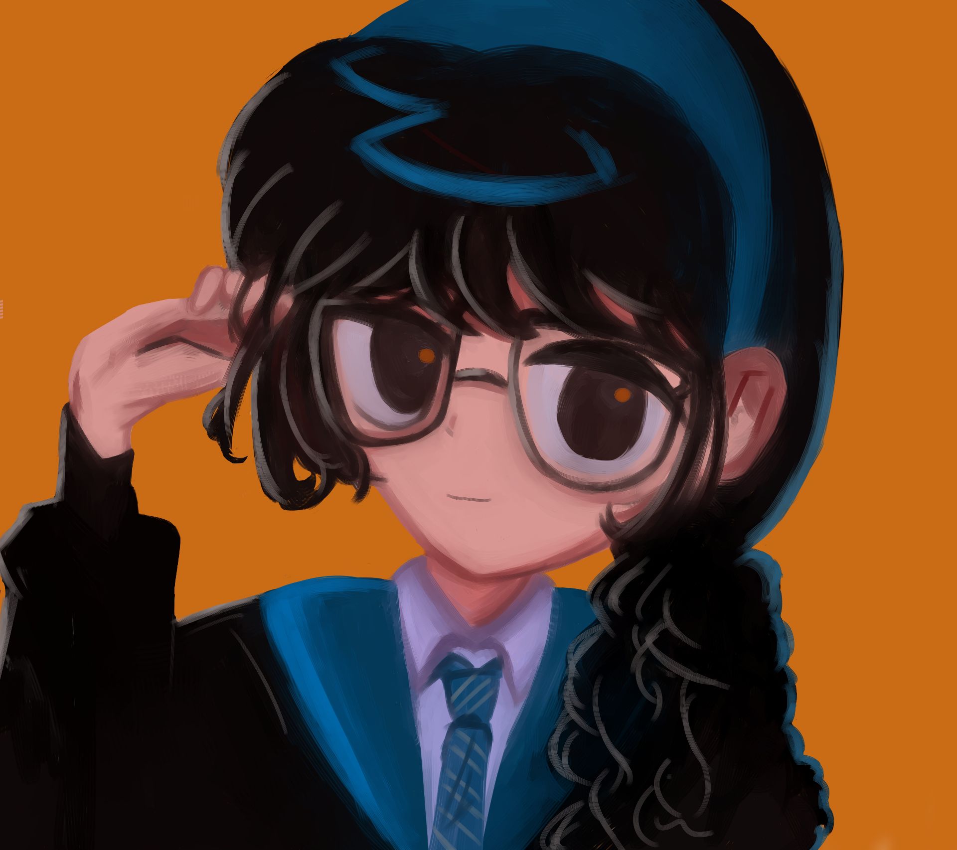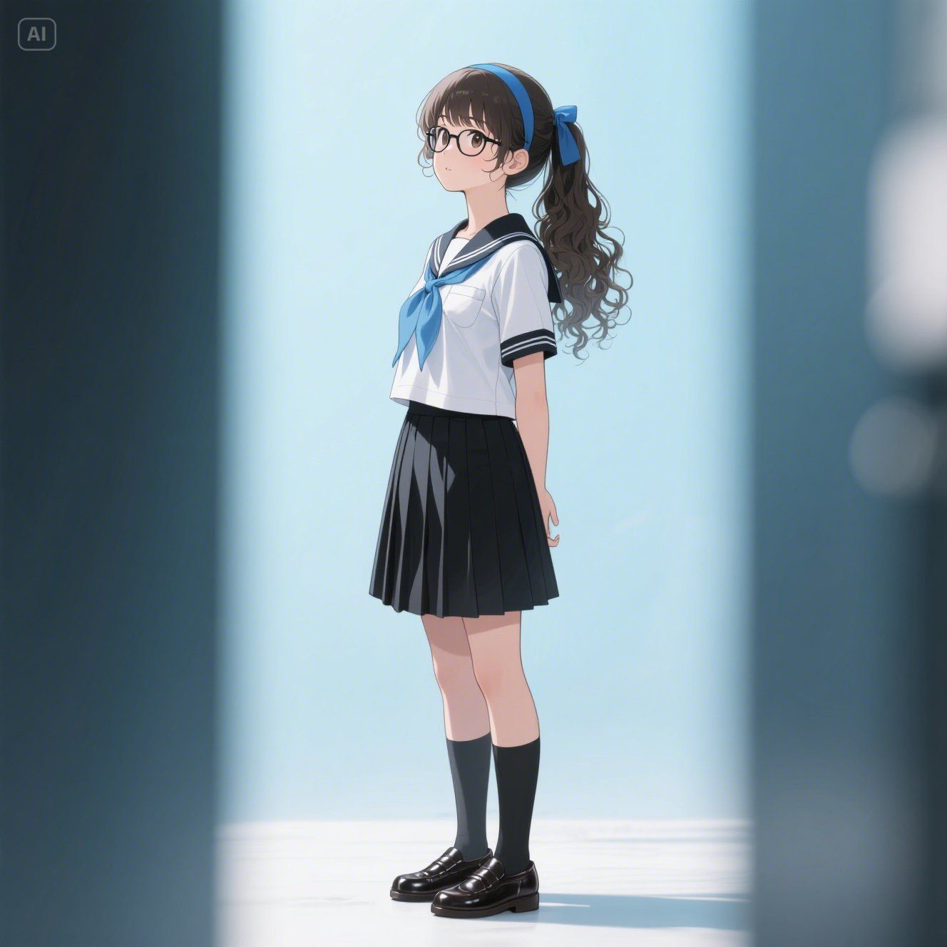 配件:藍色髮箍、眼鏡。