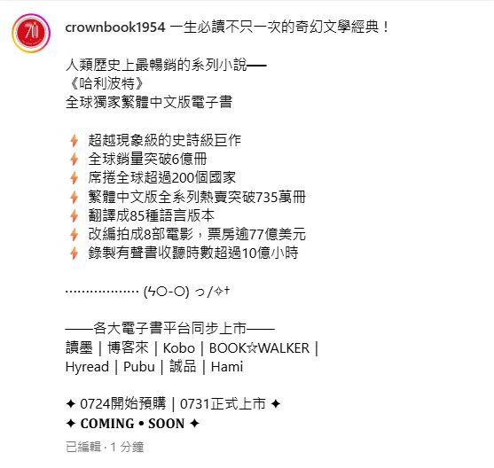《哈利波特》 全球獨家繁體中文版電子書 ——各大電子書平台同步上市—— 讀墨|博客來|Kobo|BOOK☆WALKER| Hyread|Pubu|誠品|Hami ✦ 0724開始預購|0731正式上市 ✦ ✦ 𝐂𝐎𝐌𝐈𝐍𝐆 ⦁ 𝐒𝐎𝐎𝐍 ✦ 9