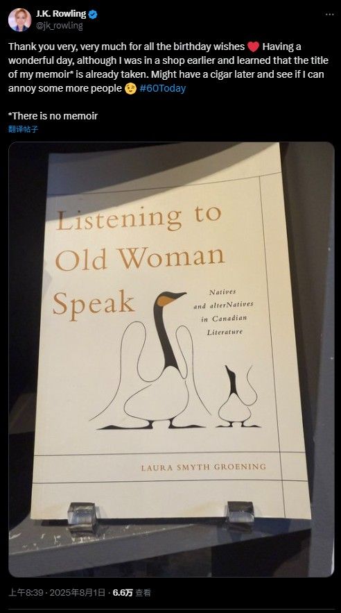 昨天7月31日,與系列故事主人公同一天生日的羅琳迎來人生六十大壽。 她照例在X(舊稱:推特)更新自己的動態,感謝所有人的生日祝福。 她配了一張圖(聽聽老女人說話),並以調侃的語氣/文字寫道:非常感謝大家的生日祝福❤️度過了愉快的一天,雖然我早前在一家店裡發現人生回憶錄的標題已經被別人用了, 不過我等等可能會抽根雪茄,看看能不能再惹些人生氣。 她也在動態中解釋了自己目前並沒有出版回憶錄的規劃。 來源 11