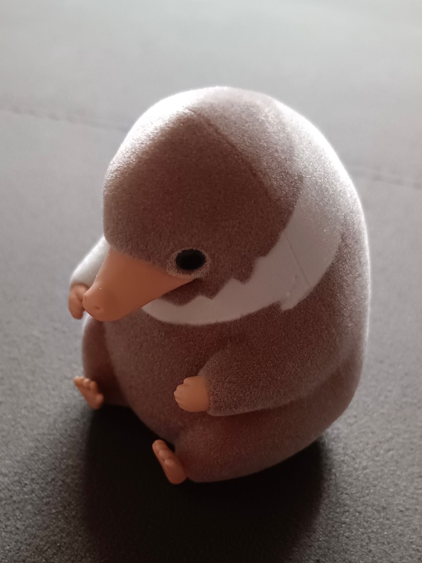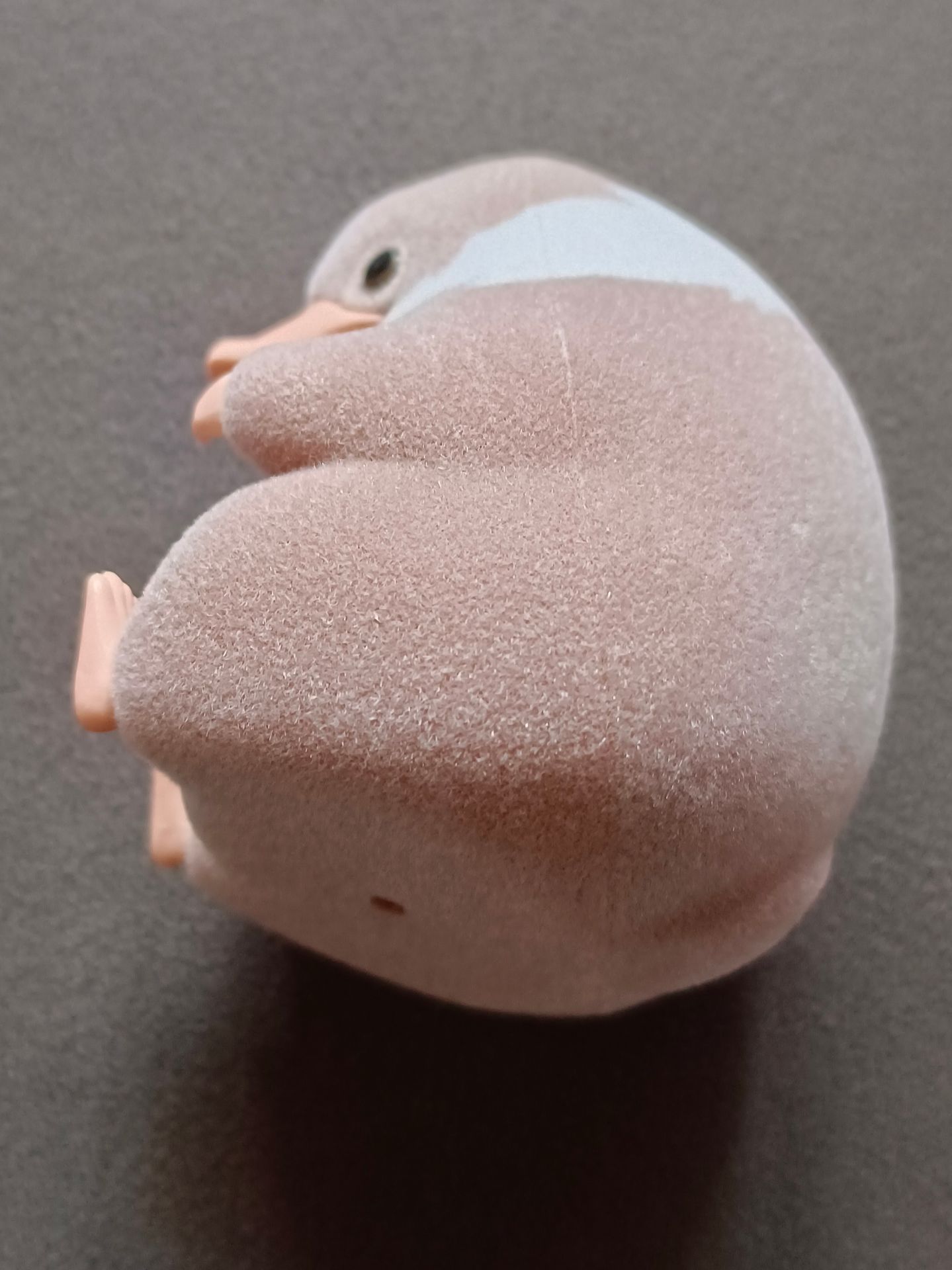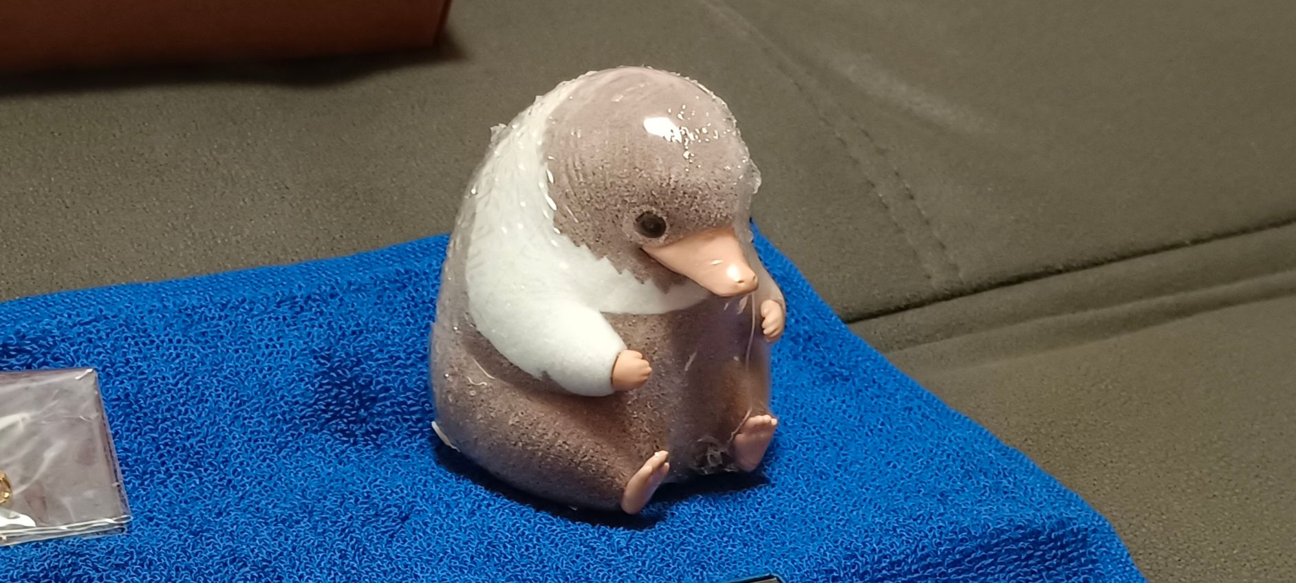 塑膠膜包覆的淺色玻璃獸寶寶,手手和腳腳都小小的、萌萌的,可可愛愛,裡面的絨毛細細地,彷彿可以想到摸起來軟軟地觸感。