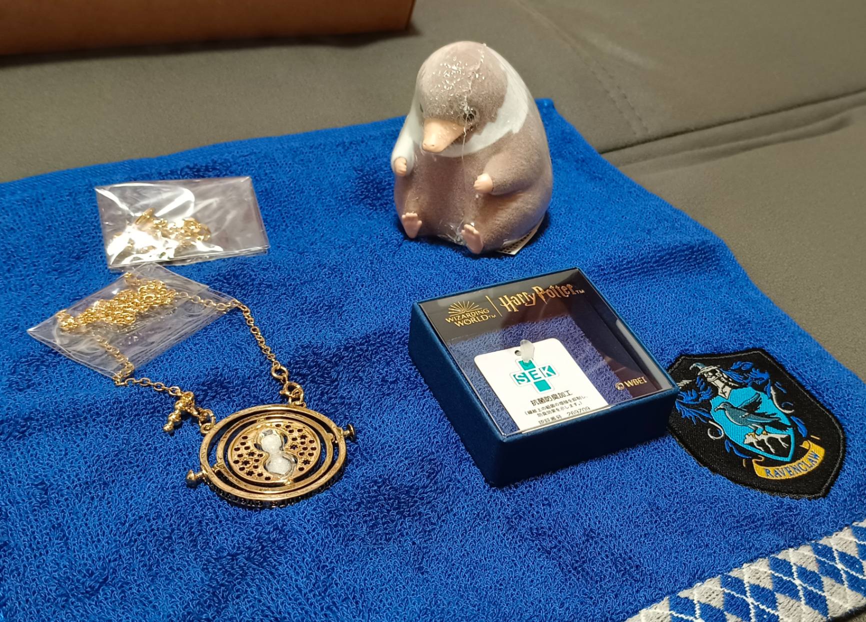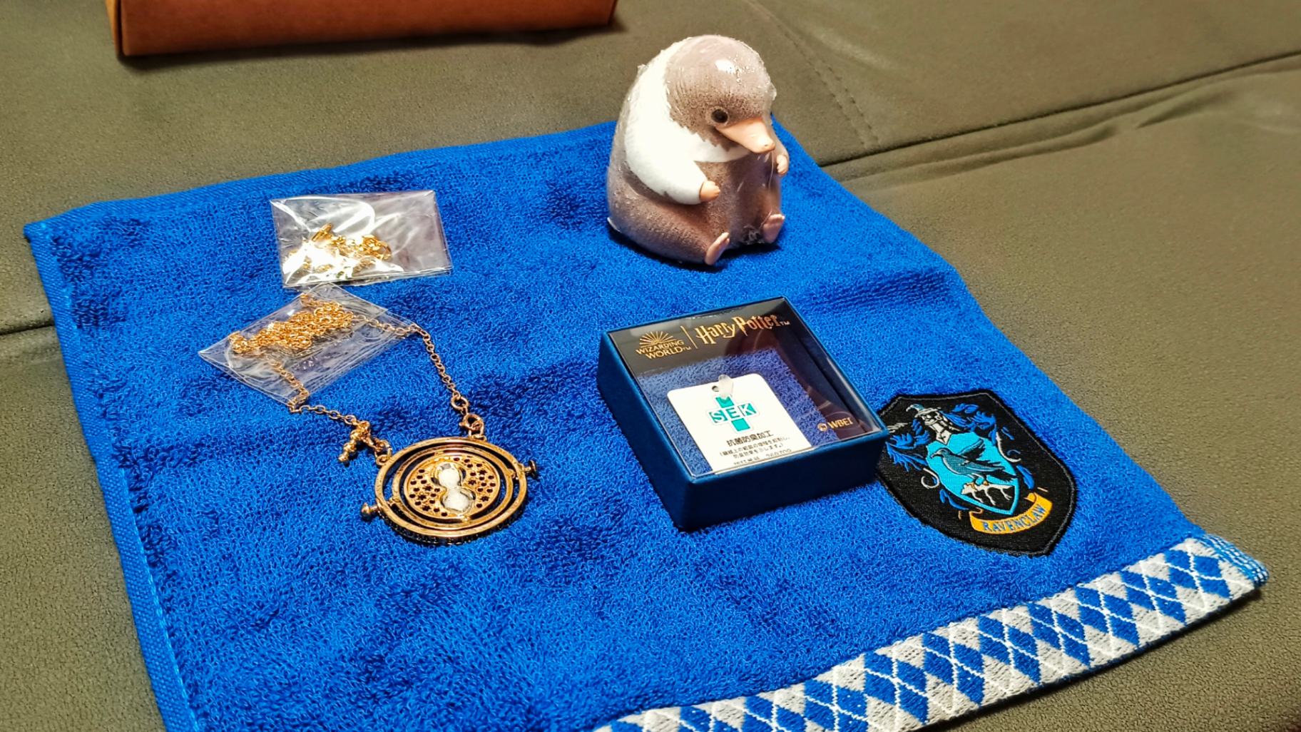 (你將活動抽中的手帕,請朋友代買的時光器,和朋友送的玻璃獸寶寶扭蛋放在一起拍了個合照,並結束本次的分享。)