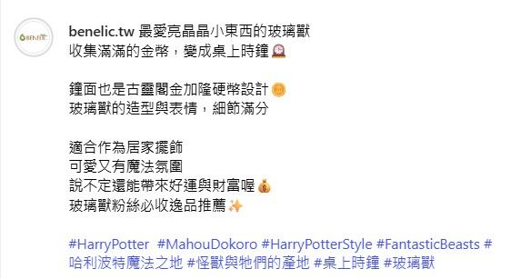 如題,南港lalaport魔法之地上新品啦! 這次是可可愛愛玻璃獸桌上時鐘和亮燈魔杖鑰匙圈 第一款新品為玻璃獸桌上時鐘 作為擺設,可愛又實用 第二款是亮燈魔杖鑰匙圈 款式一共有四款,分別為哈利、榮恩、妙麗和露娜 8