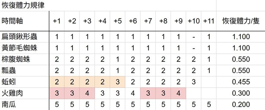 | 南瓜 | 0.20 hr / 隻 | - | 13納 | 沒時間翻石頭的最好選擇; 但貓頭鷹體力偏低時,手會很痠(# |