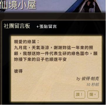 社群活動:仙境小屋的傳承 II (9/15 ~ 9/28)第一週(第 679 回合)起:在仙境小屋留言,點名任何一位「社團家庭小精靈」,對他說出你想送他什麼樣的衣服、讓他開心地穿著回到社團總部。