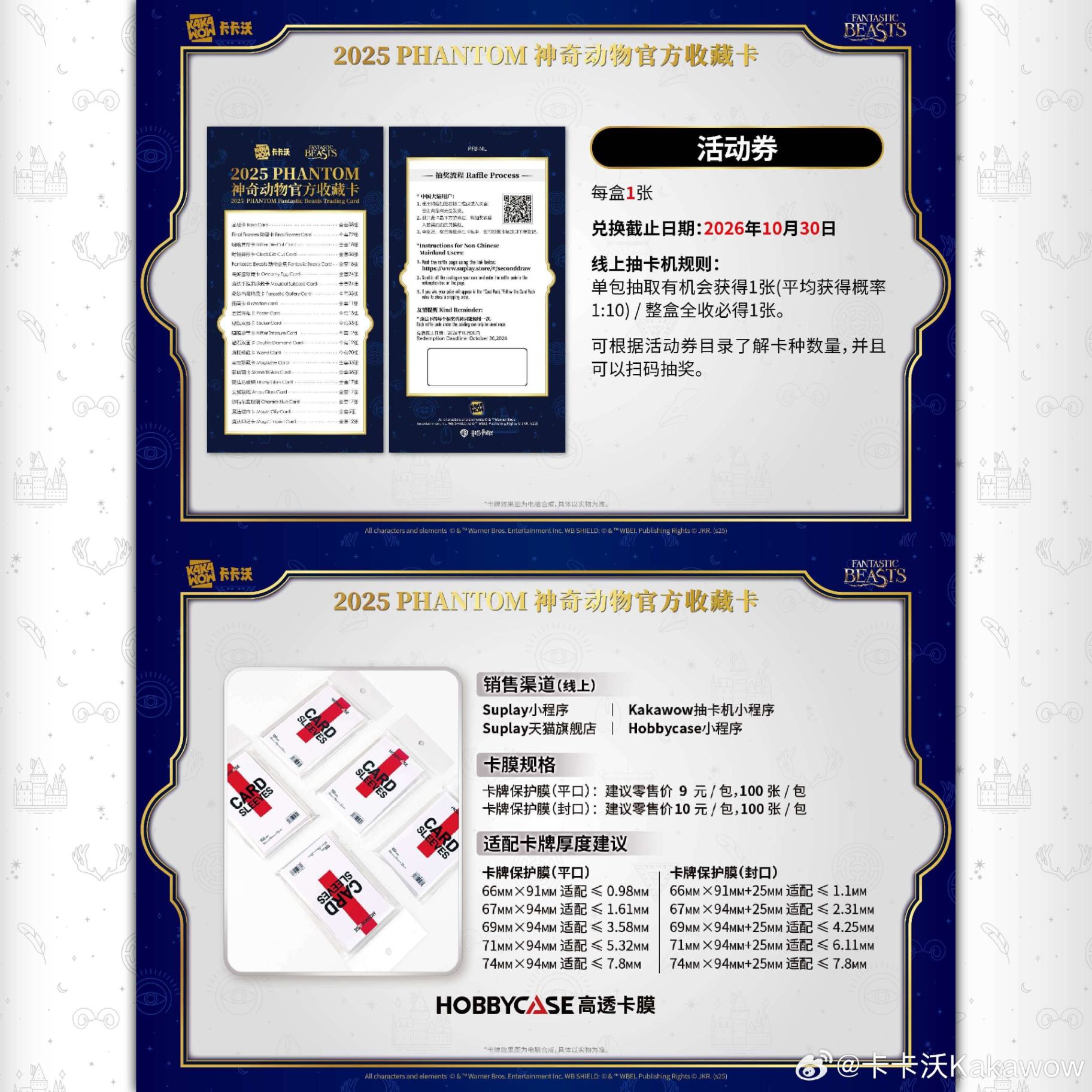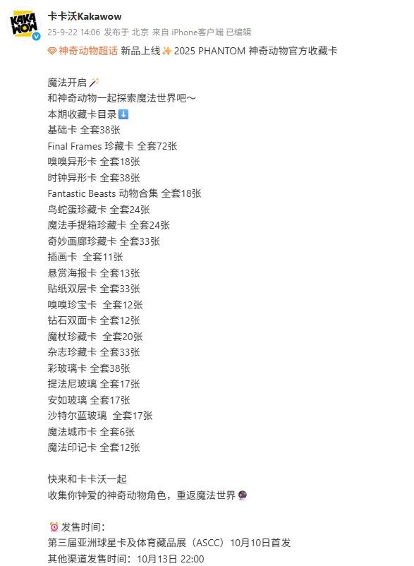 又有新卡可以收藏啦! 卡卡沃推出新品:2025 PHANTOM 怪獸與他們的產地系列(神奇動物系列)官方收藏卡 發售時間: 第三屆亞洲球星卡與體育藏品展(ASCC)10月10日首發 其他渠道發售時間:10月13日 22:00 5