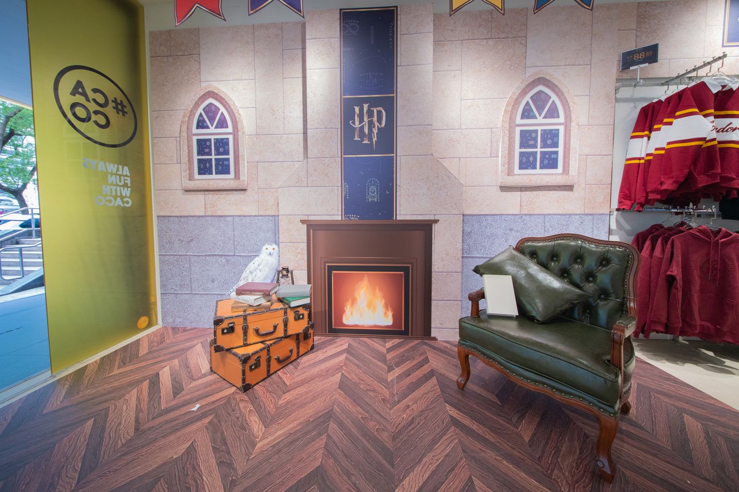 今年的快閃店以「霍格華茲新生季」作為主題,而 CACO 也推出新的《哈利波特》聯名服飾,以霍格華茲四學院為靈感推出大學T、襯衫、棒球外套等多樣單品,並搭配可替換的魔鬼氈徽章,讓粉絲自由混搭學院風格。除此之外,
