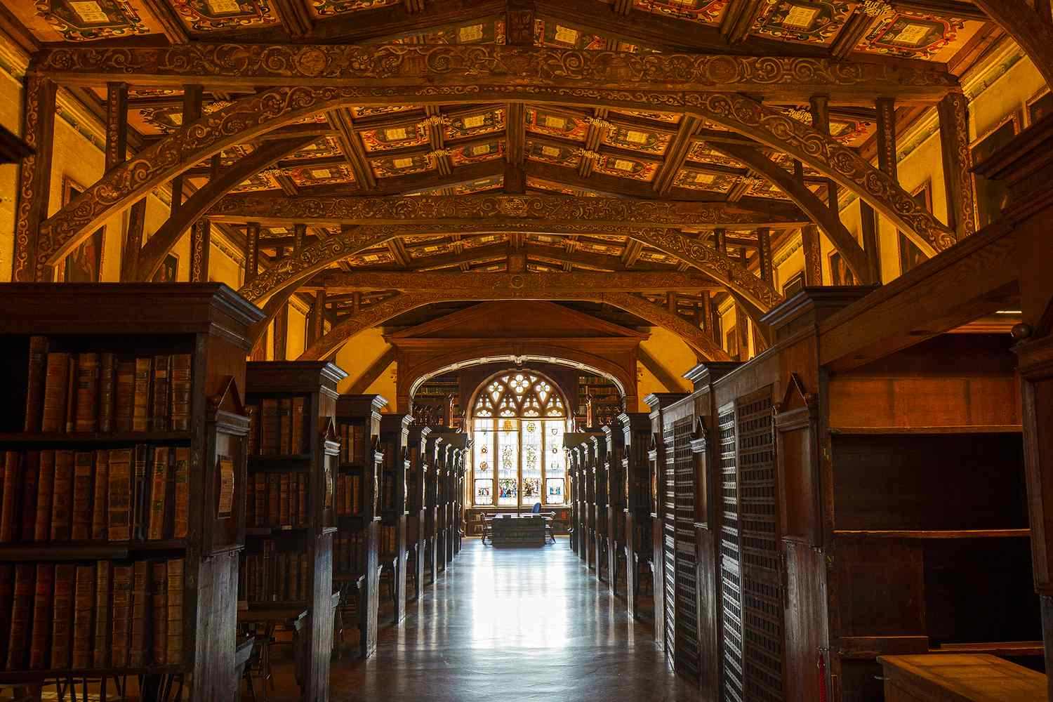 ▲ 放一張沒能親眼參觀的資料照片,事實上這個老圖書館的遠景並沒有入鏡【神秘的魔法石】電影,但是從遠方的彩繪玻璃窗,以及書櫃旁的格柵門可以辨識出來,哈利躲在隱形斗篷內經過的禁書區書架的確出自這邊。