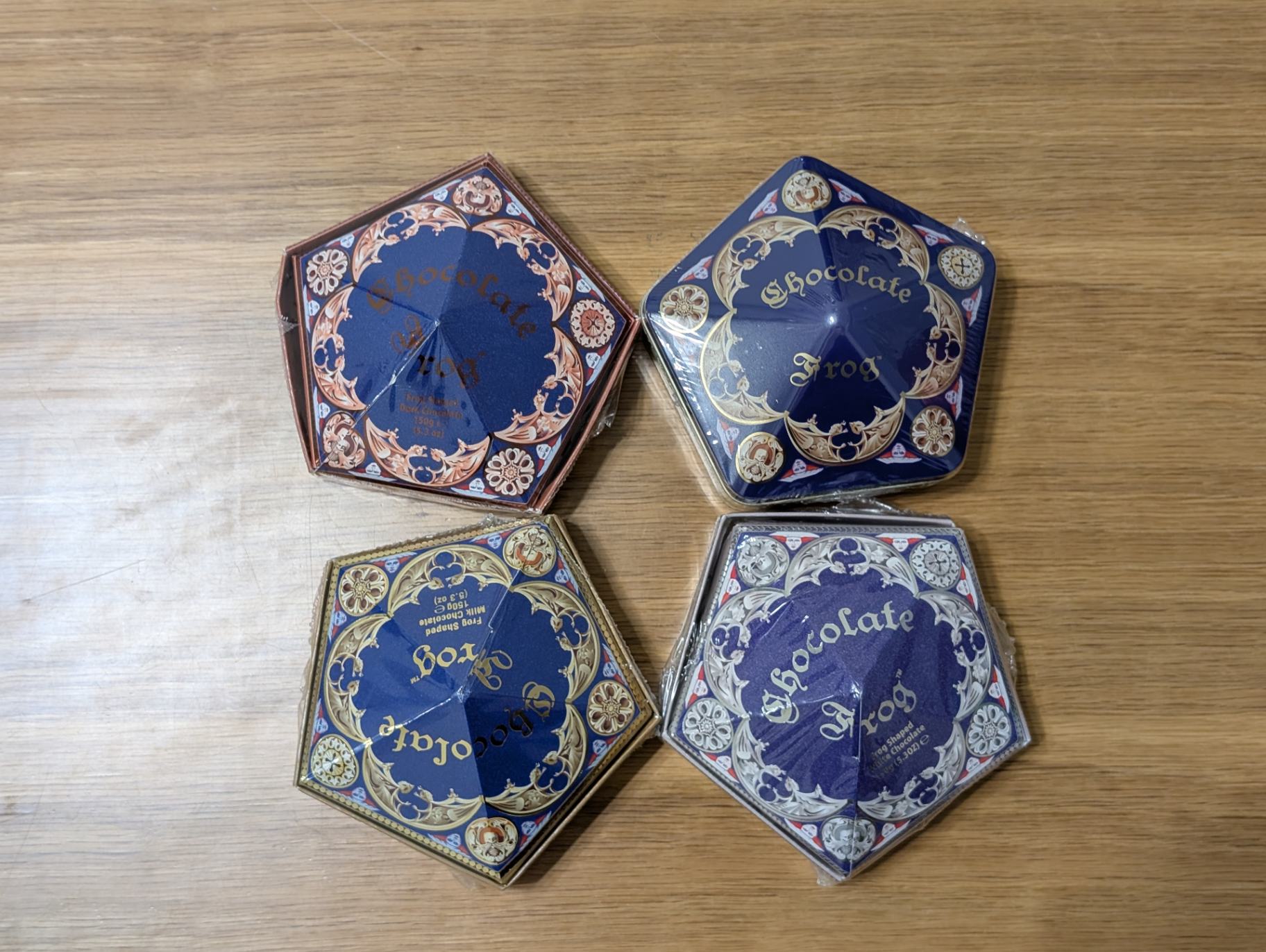 黑巧克力(紙盒)、牛奶巧克力(鐵盒)、牛奶巧克力(紙盒)、白巧克力(紙盒)