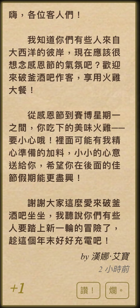 魔法生涯:感恩節快閃活動-火雞派對 (11/27 ~ 12/1) 破釜留言板有新留言