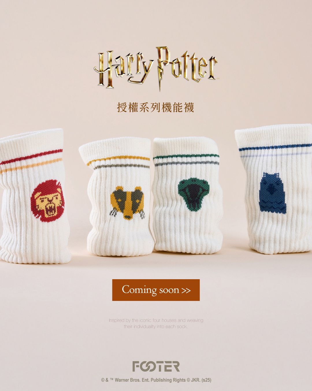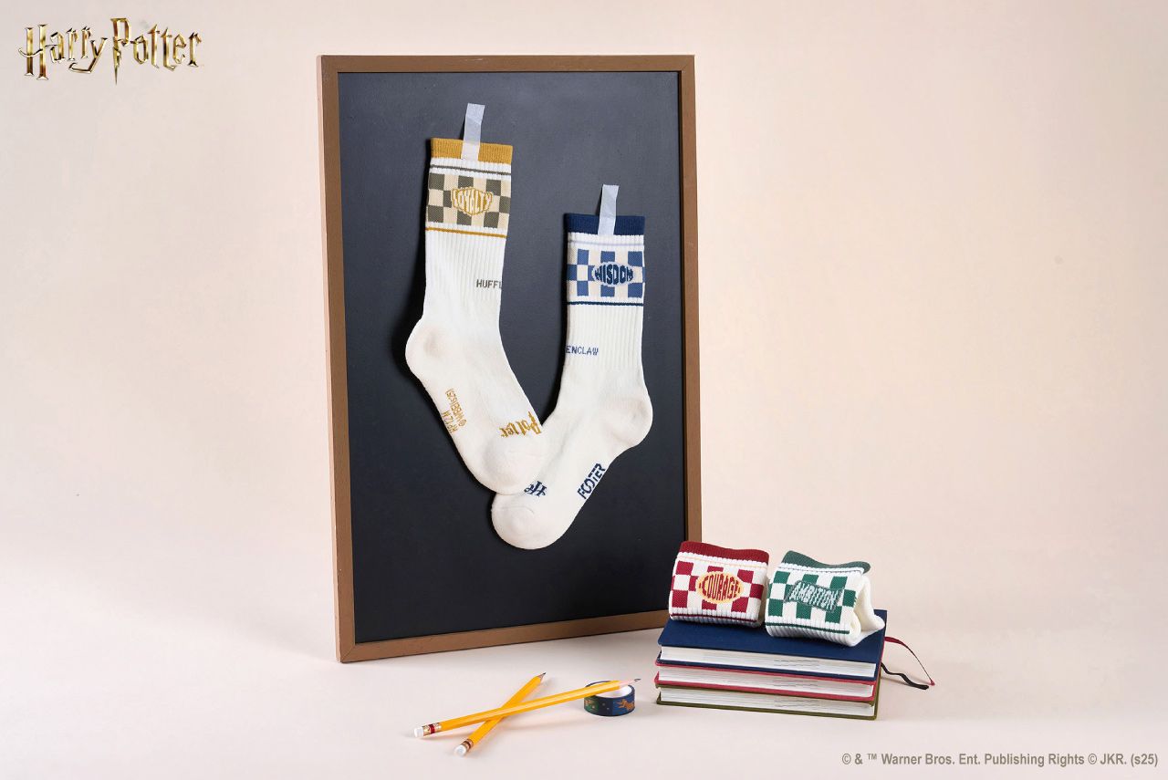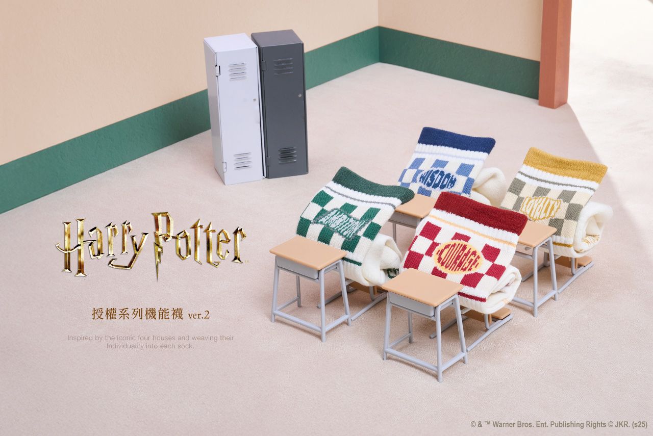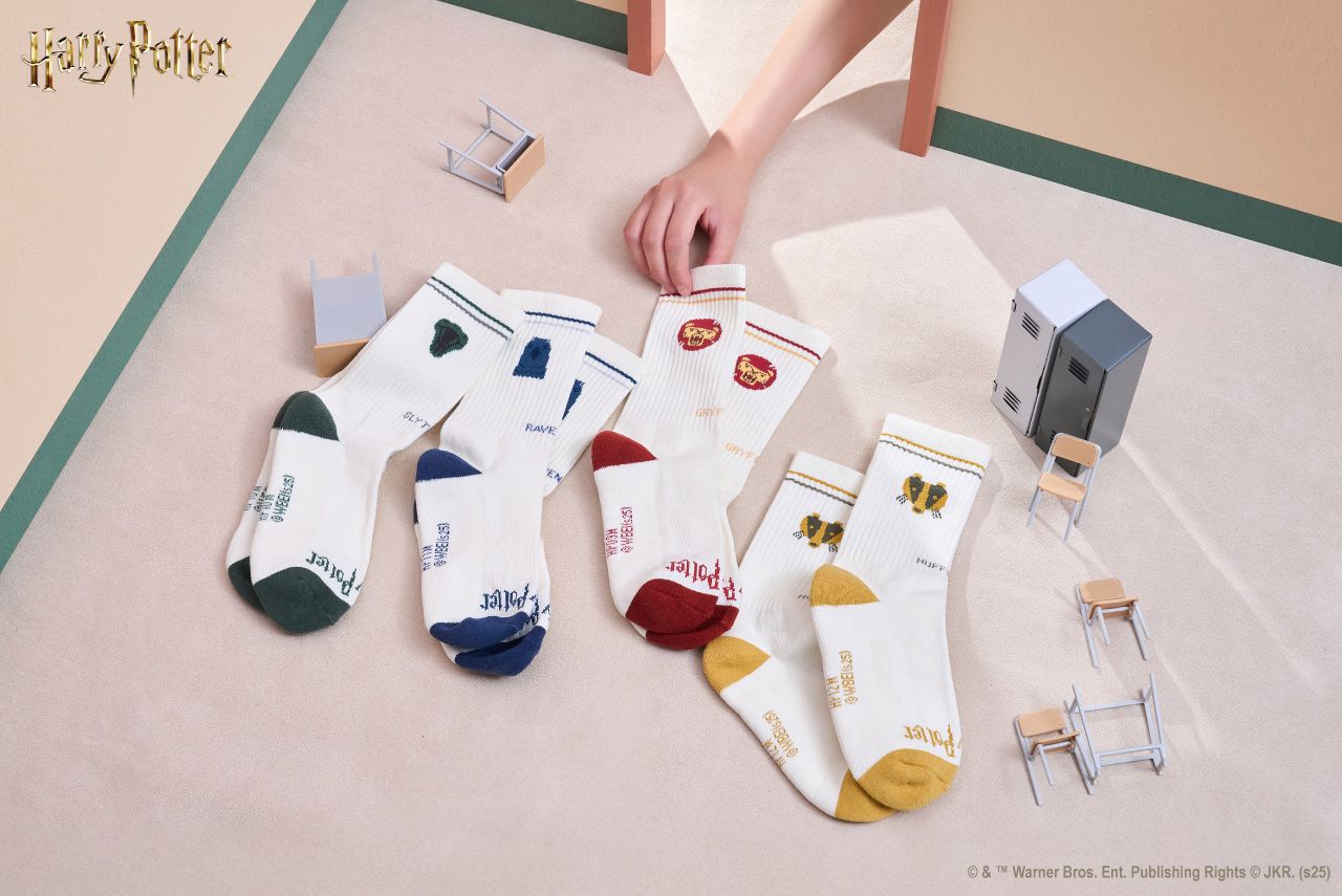 將霍格華茲四個學院的代表動物:獅子、蛇、渡鴉、獾的象征細節織入襪款設計