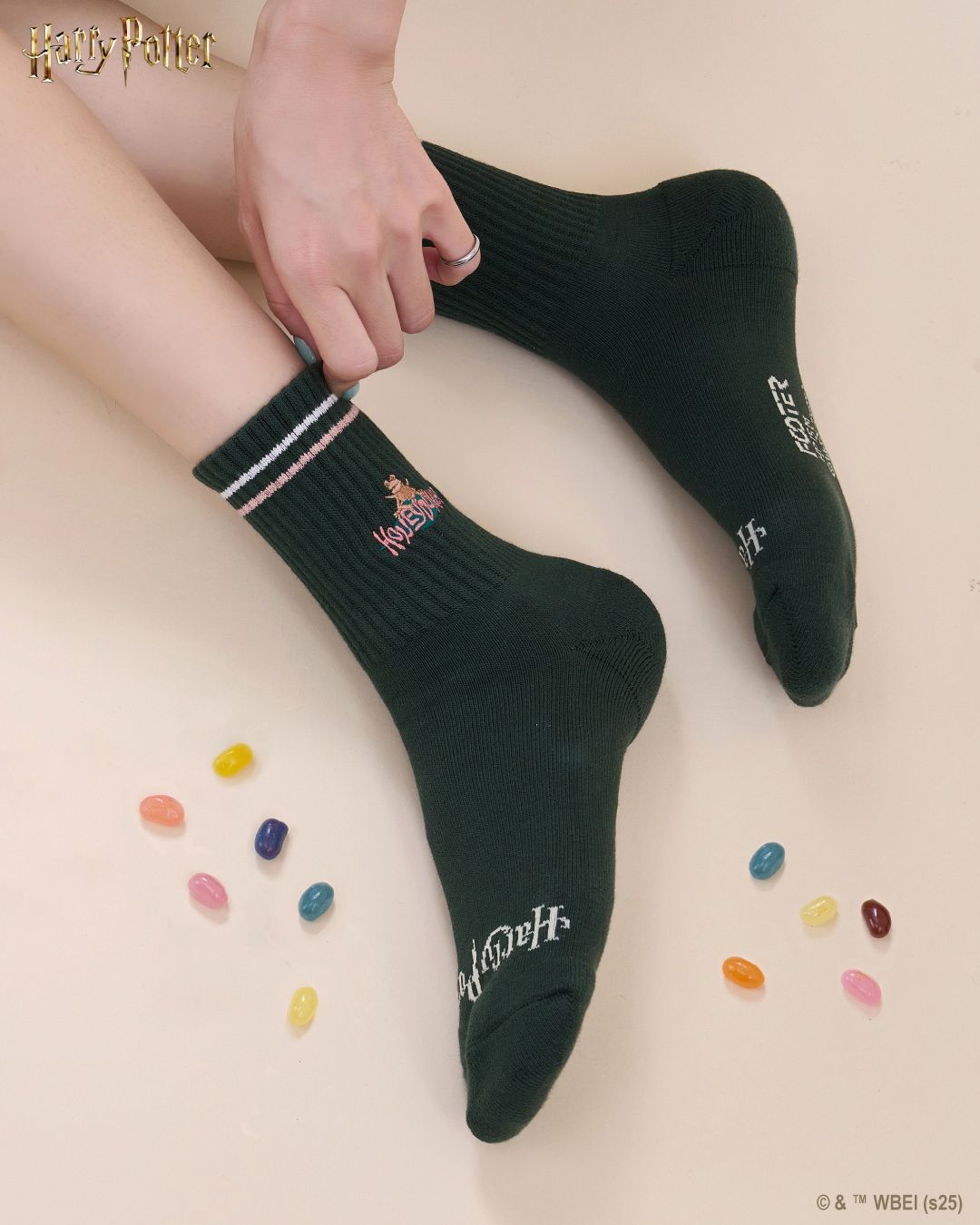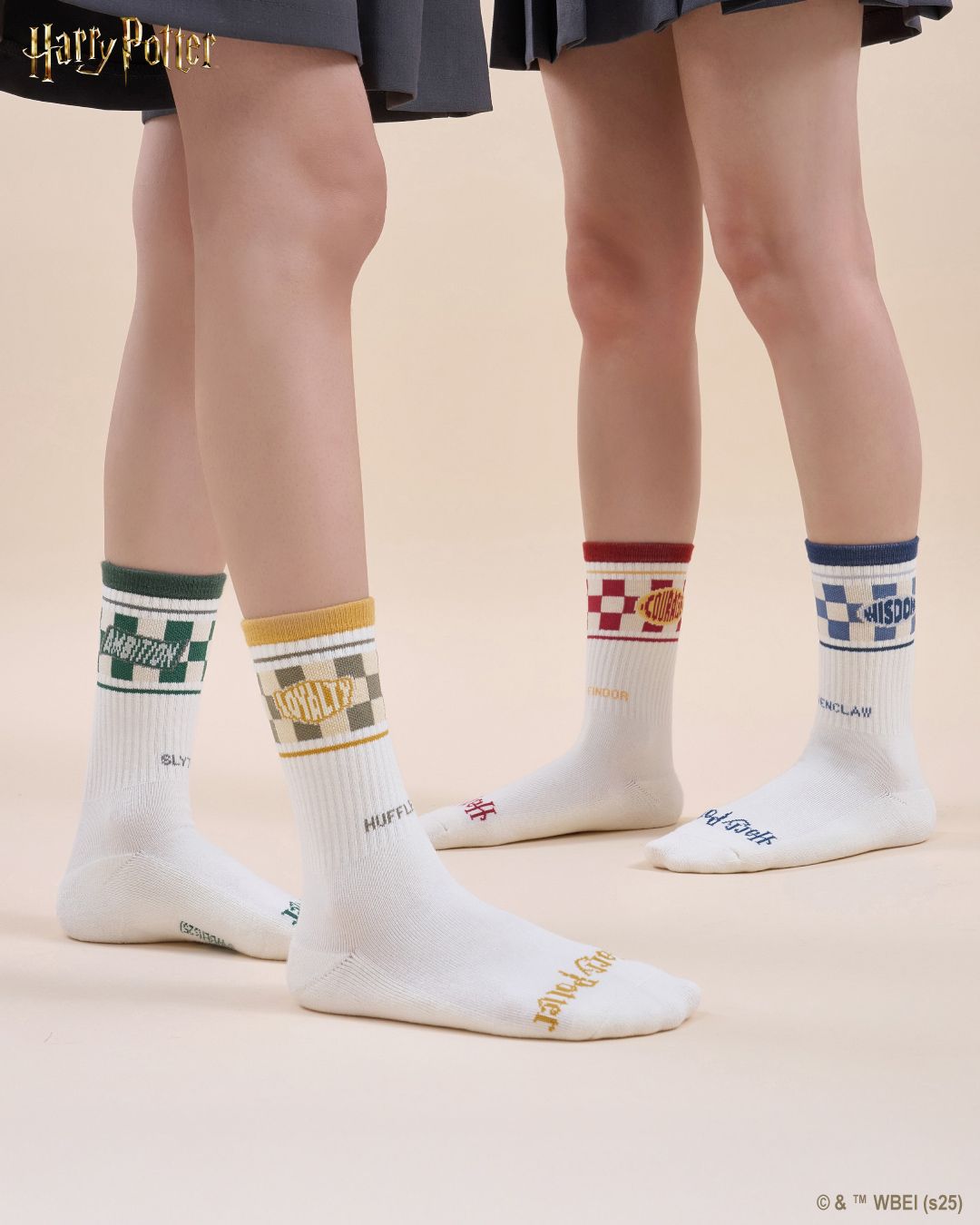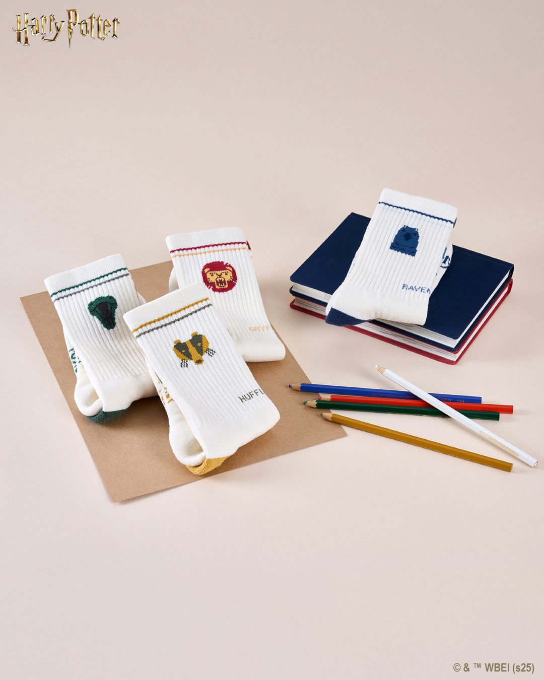 將霍格華茲四個學院的代表動物:獅子、蛇、渡鴉、獾的象征細節織入襪款設計