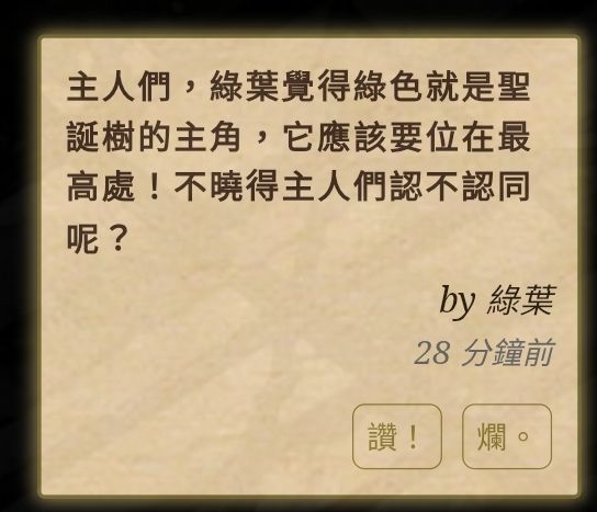 剛在社團發現綠葉留了新的消息,莫非是六彩聖誕枝葉的排列順序?