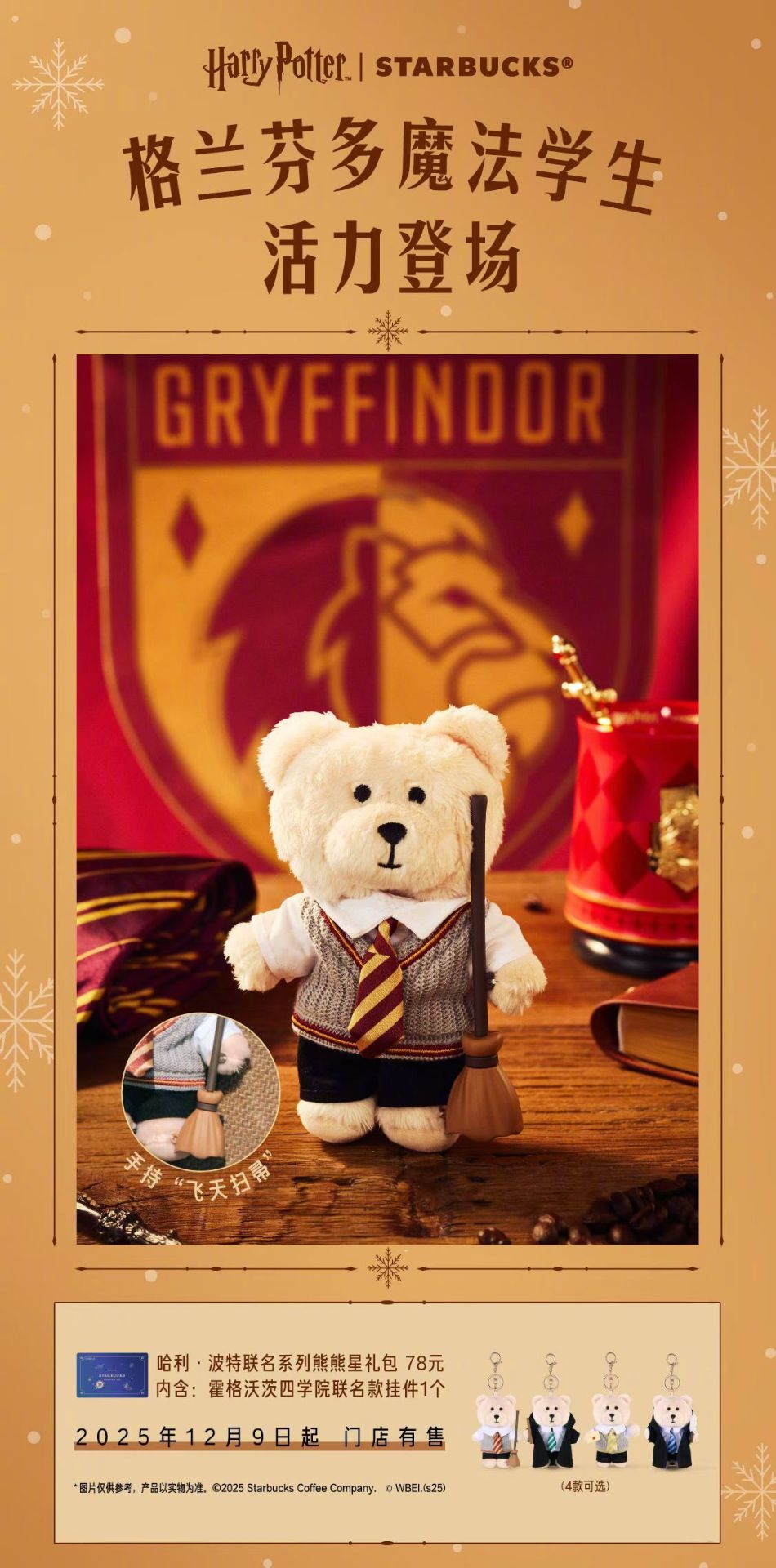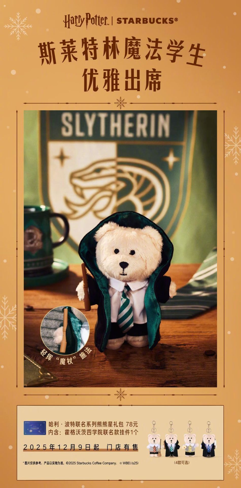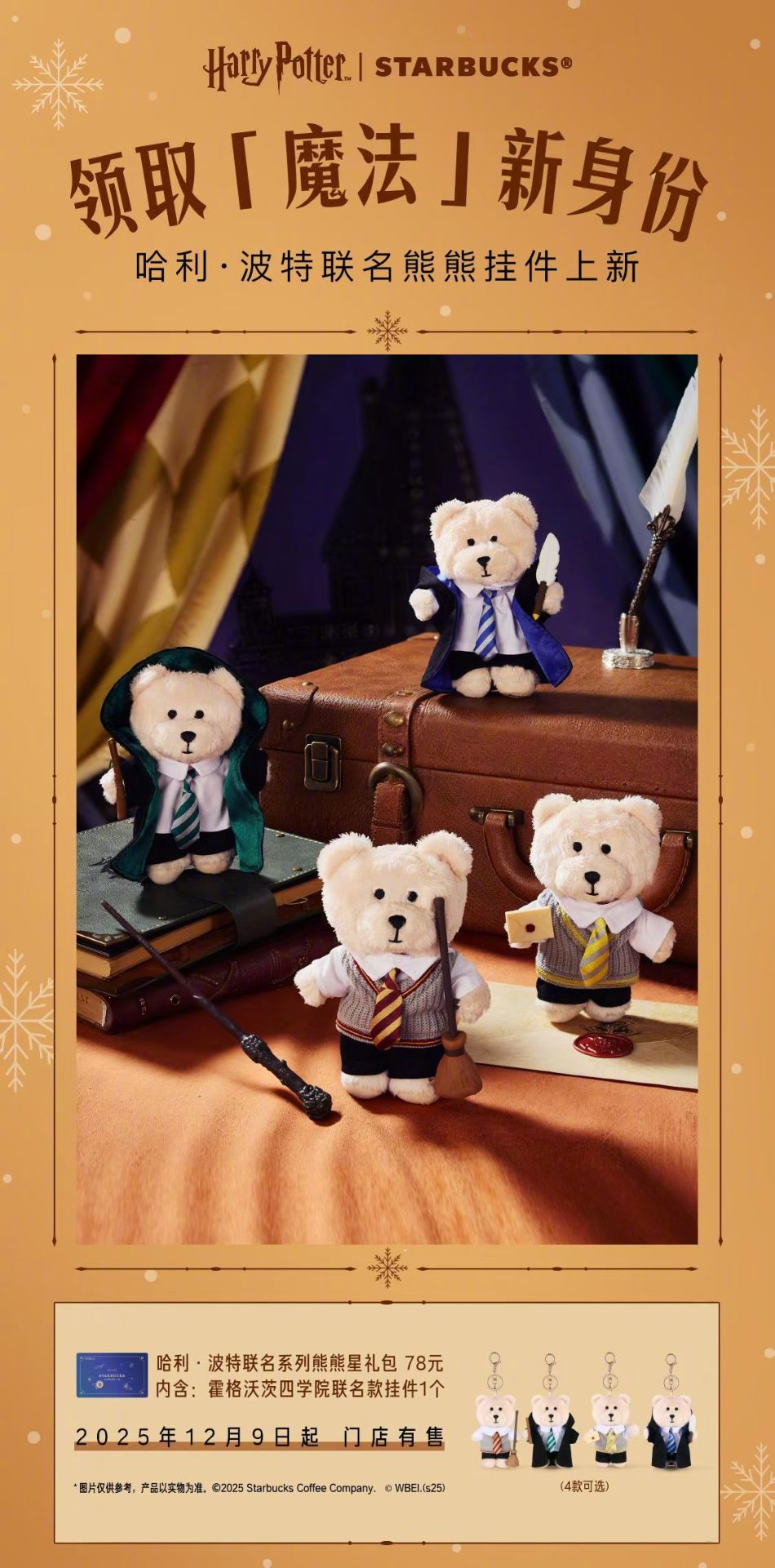 這次聯名推出的周邊有魔法學院杯套、紙杯、杯墊、紙袋、魔杖擺件、四學院熊熊擺件、魔法慶典聯名徽章和貼紙。