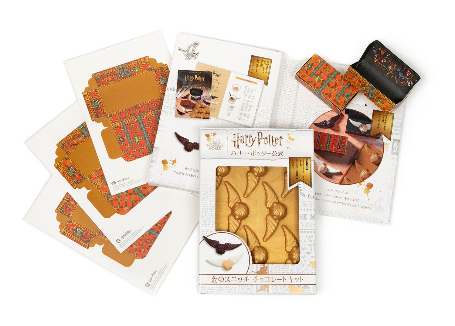 商品內容包含:矽膠模具、魁地奇造型的禮物盒、食譜書,並加贈一本附有時尚軟質皮革封面的「巧克力蛙 A5 筆記本」。