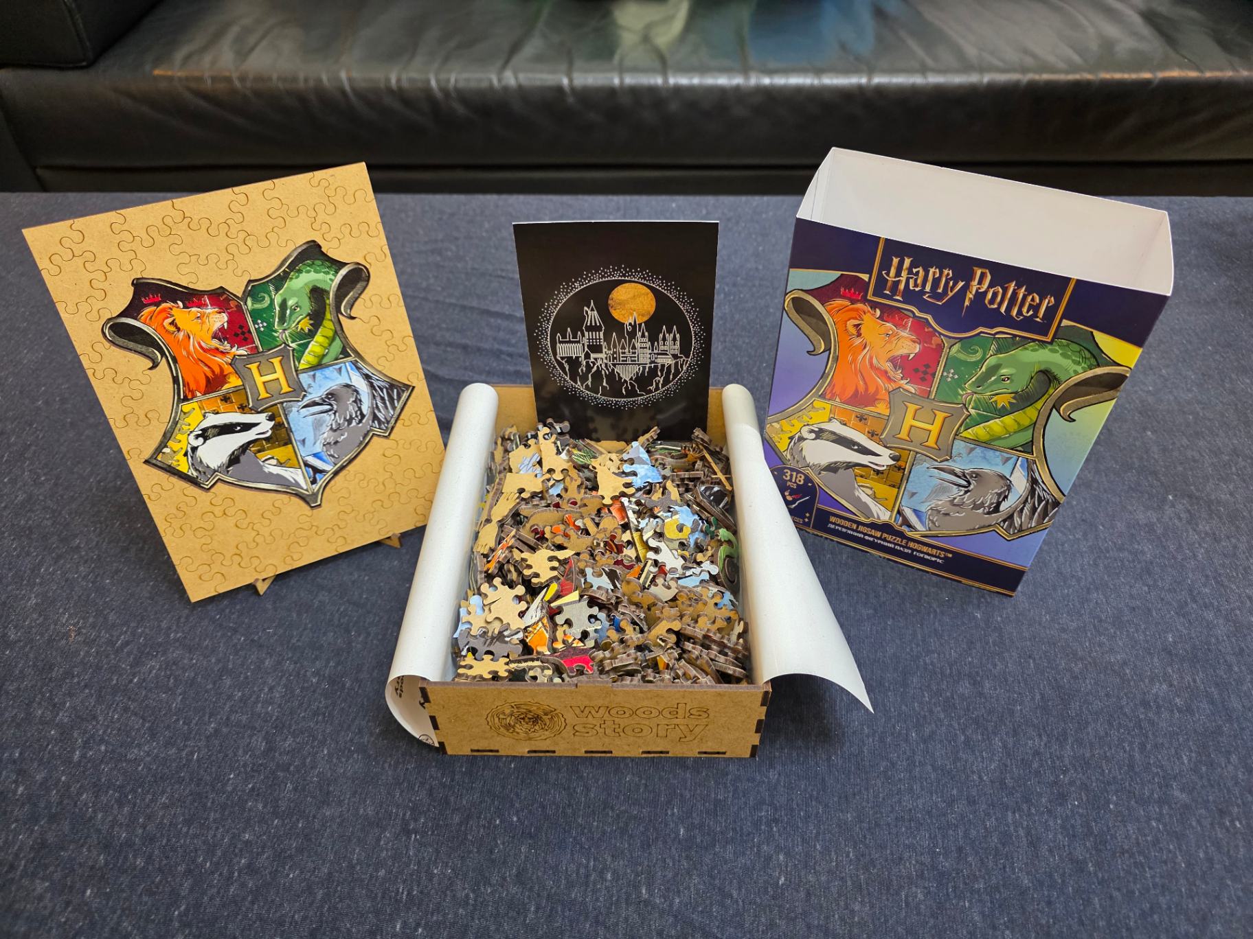 木盒內裝了 318 片木製拼圖,以及一張明信片,