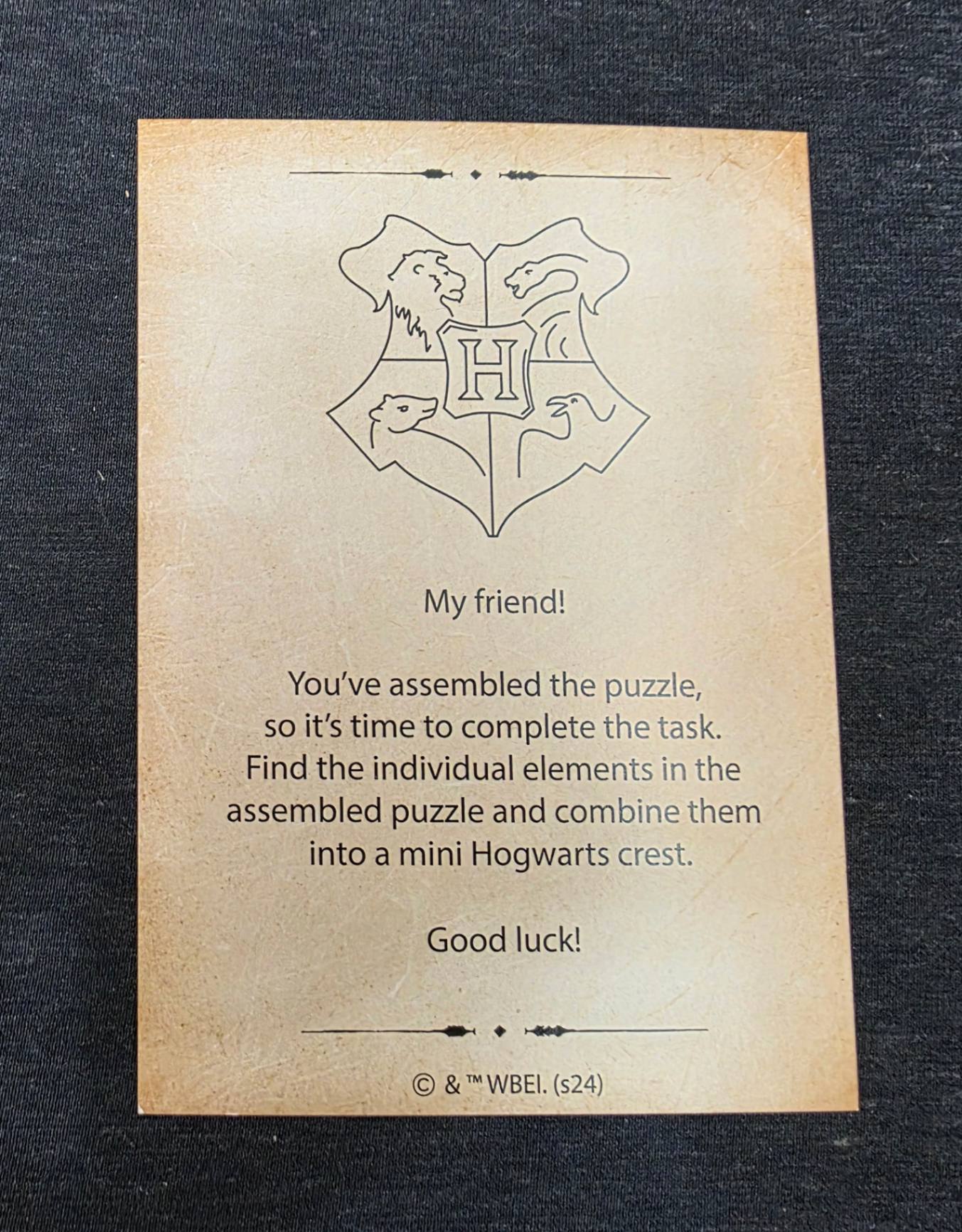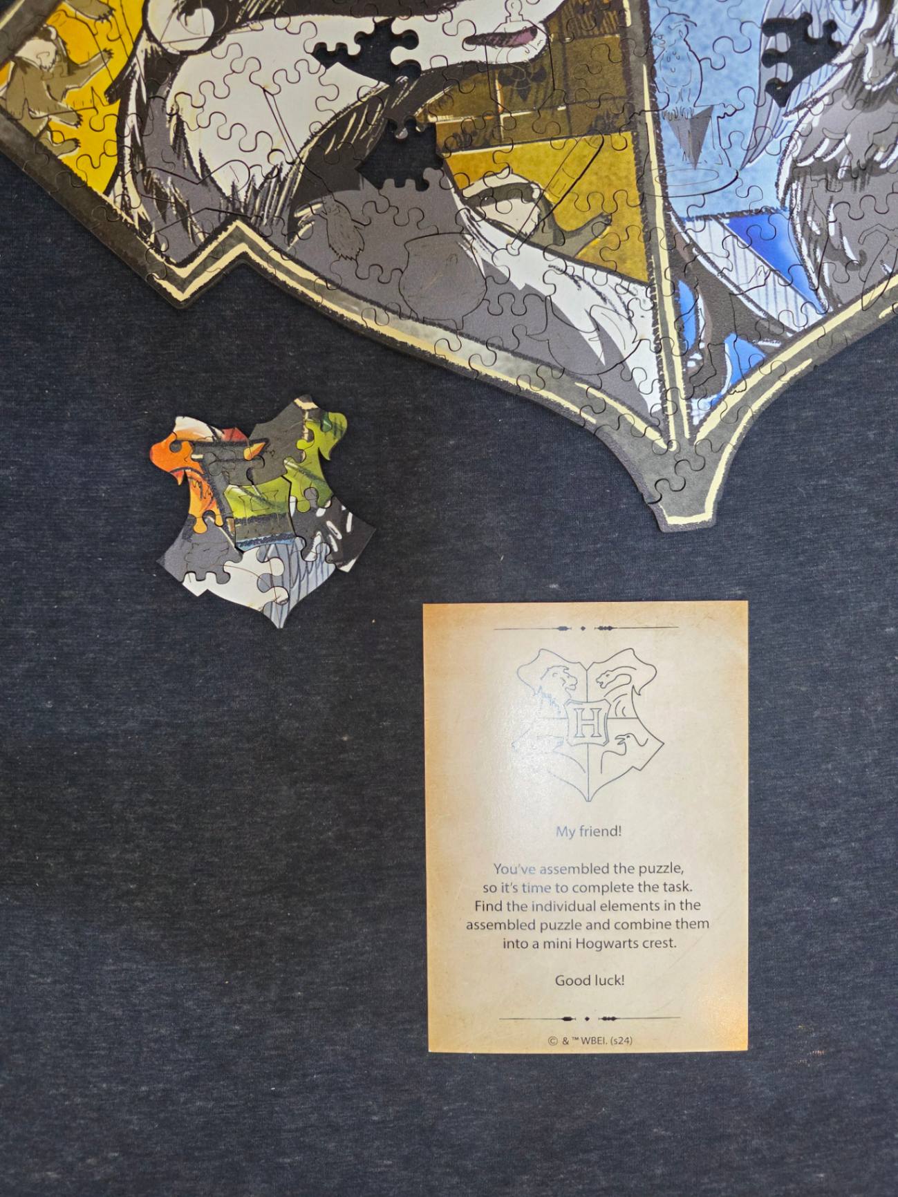 「我的朋友!你已經組合完拼圖,現在是時候完成任務了。找到拼圖中的獨立元素,將它們組成一個迷你版的霍格華茲盾徽。祝好運!」