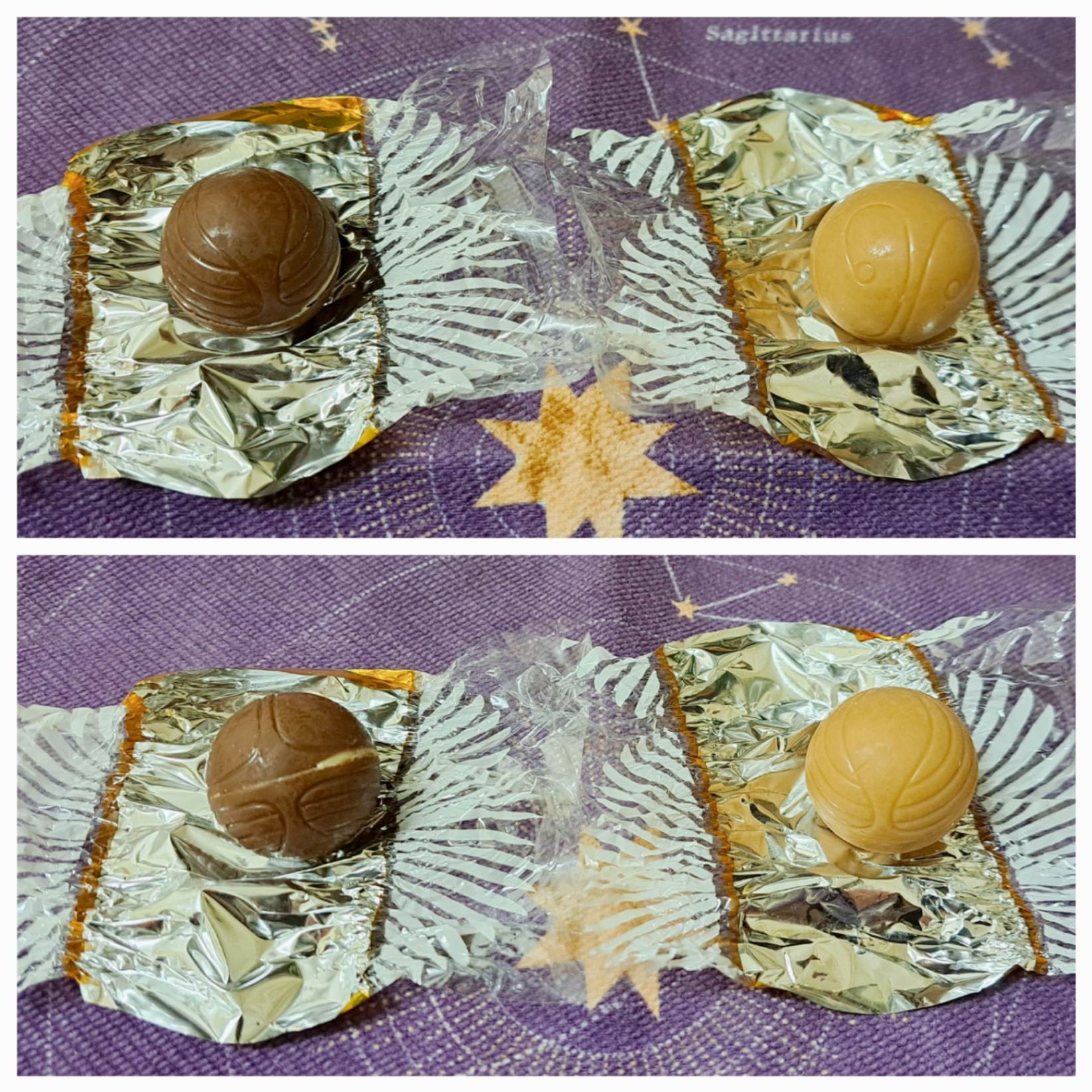 ℘ 接著、接著,沒想到巧克力本體也是有金探子的花紋裝飾,並沒有敷衍喔。嗯,外觀方面是合格的。但我也必須幫雷文克勞和赫夫帕夫的偉大球員們發聲:「太偏心了!」。接下來,便是誠實食評了,畢竟再好看也是食物,味道才是買不買的標準啊。