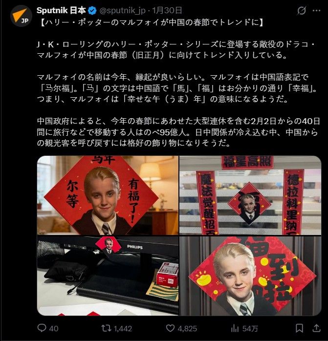 於是跩哥不再只是哈利波特系列中的反派人物,反而搖身一變,變成象征華人新年好運與富足的吉祥象征。