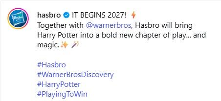 Hasbro孩之寶宣布將於2027年起成為哈利波特系列的全球主要玩具授權商,將會開發一系列以電影、影集為靈感的產品,這些產品包括玩偶、角色扮演玩具、可動人偶和收藏品、互動絨毛玩具、棋盤遊戲等。 配合HBO哈利波特影集,孩之寶與華納(Warner Bros. Discovery Global Consumer Products (WBDGCP))達成一項新的多年授權的合作協議。 新聞來源 3