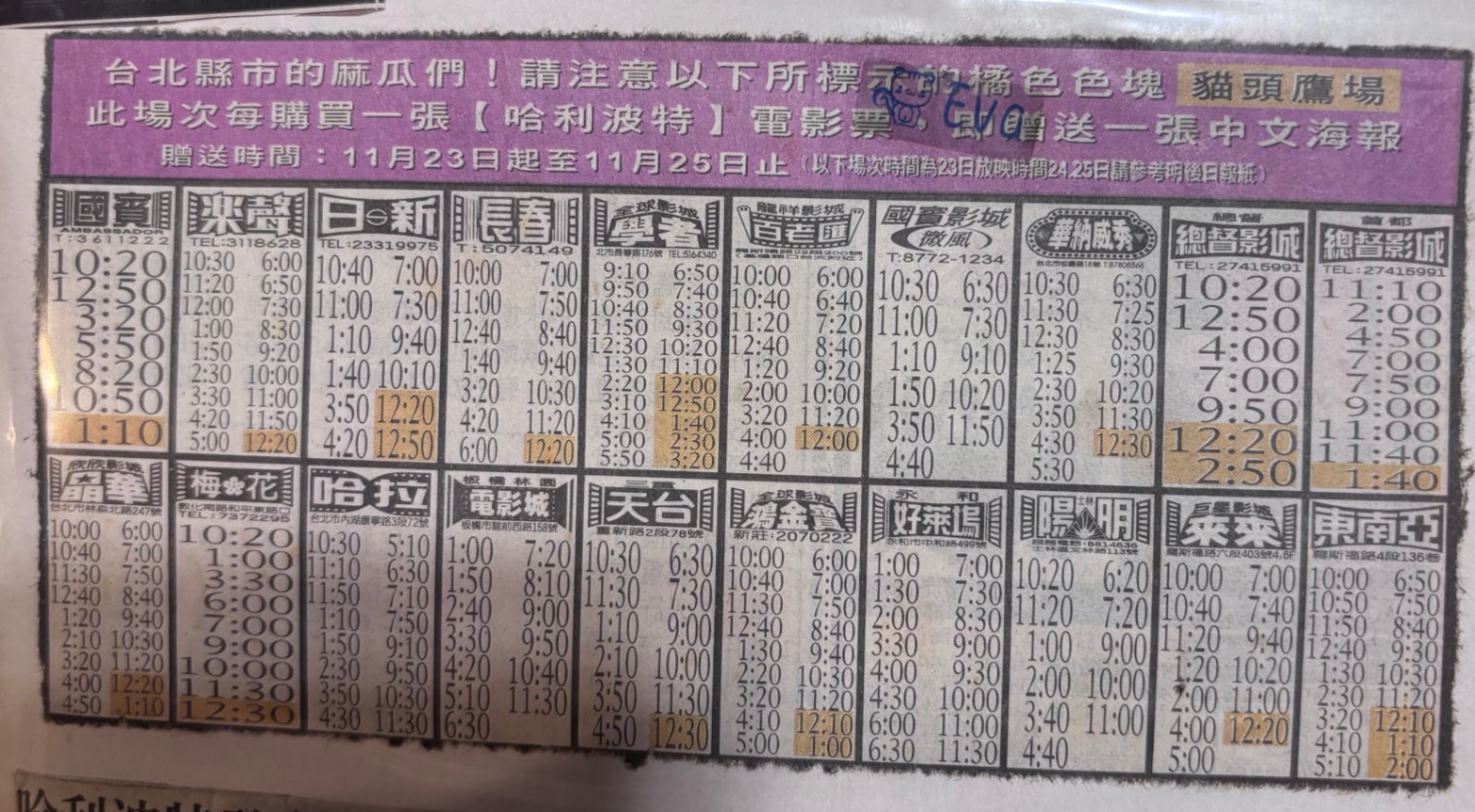 這是當年的電影時刻表,所有電影放映時間都會在報紙上,現在這些電影院有很多都消失了。