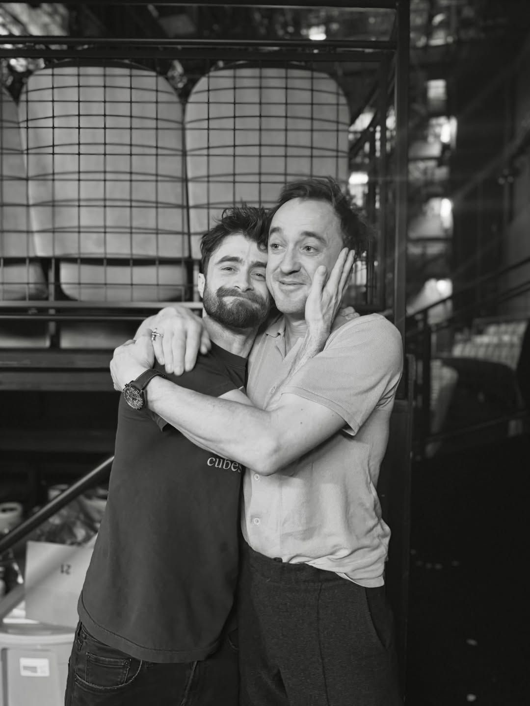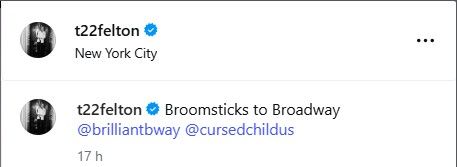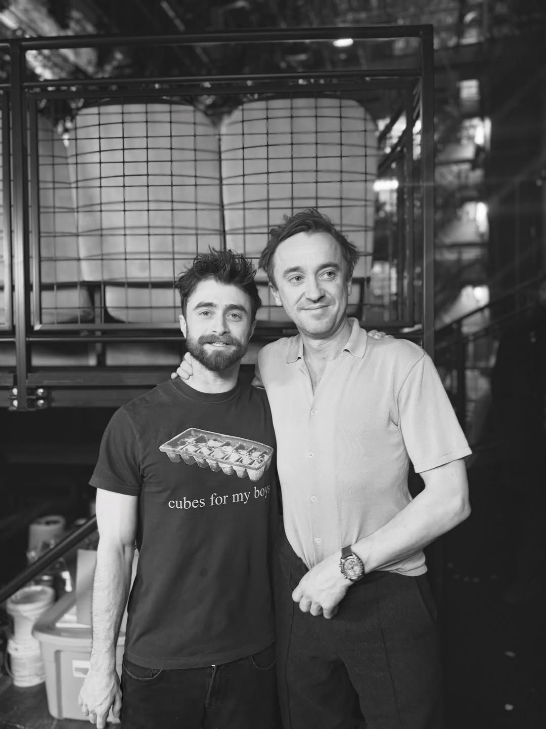 Tom除了曬出探班時兩人的合照,也曬出了一張當年兩人身穿學院魁地奇球袍的合照,並配文:Broomsticks to Broadway。