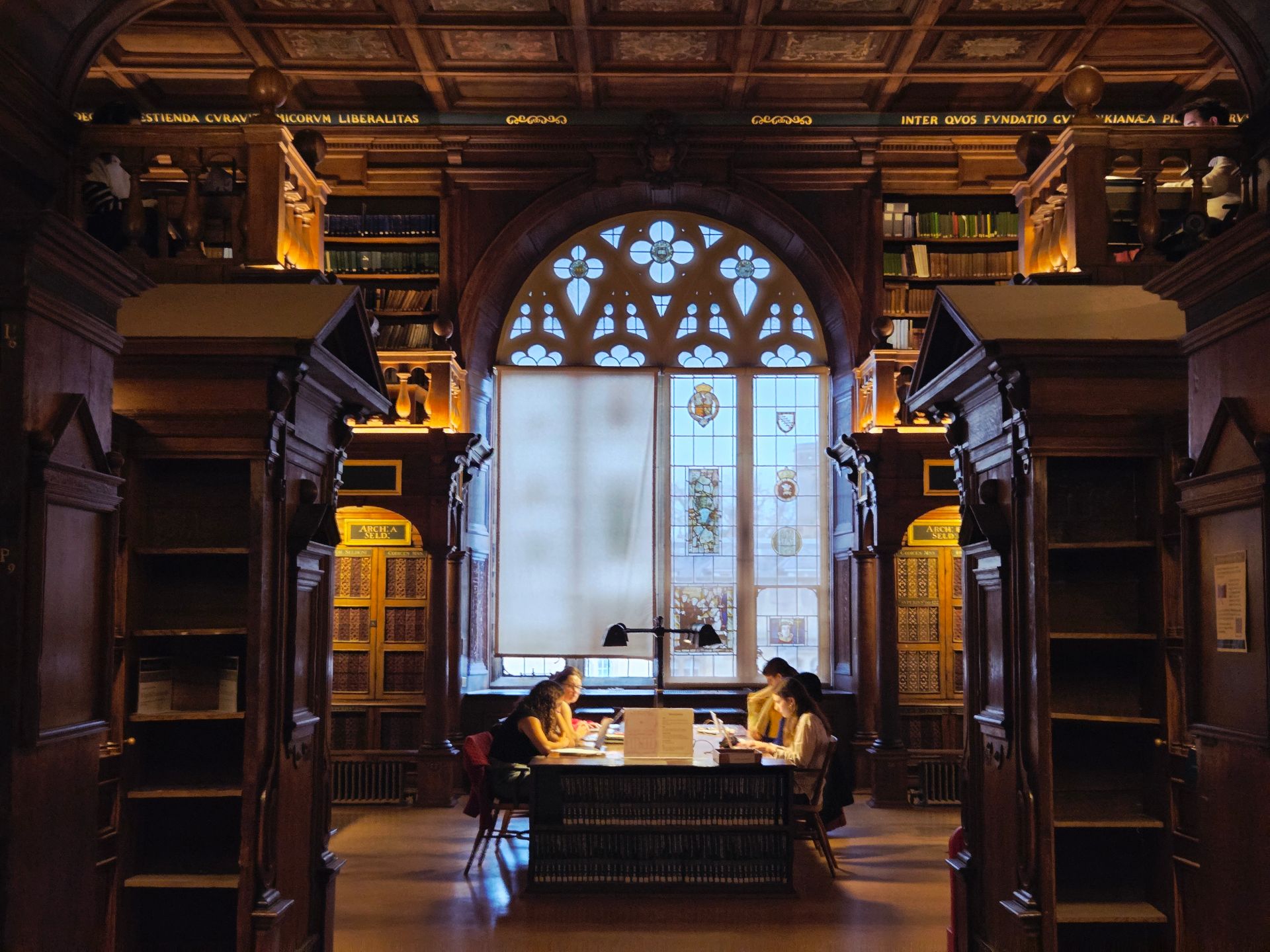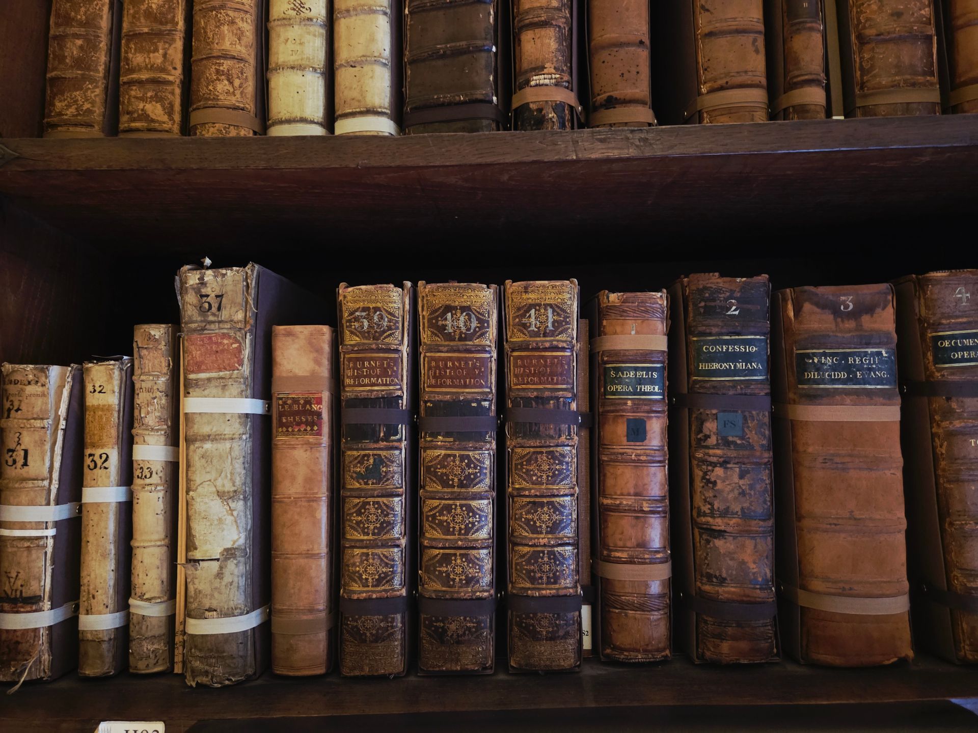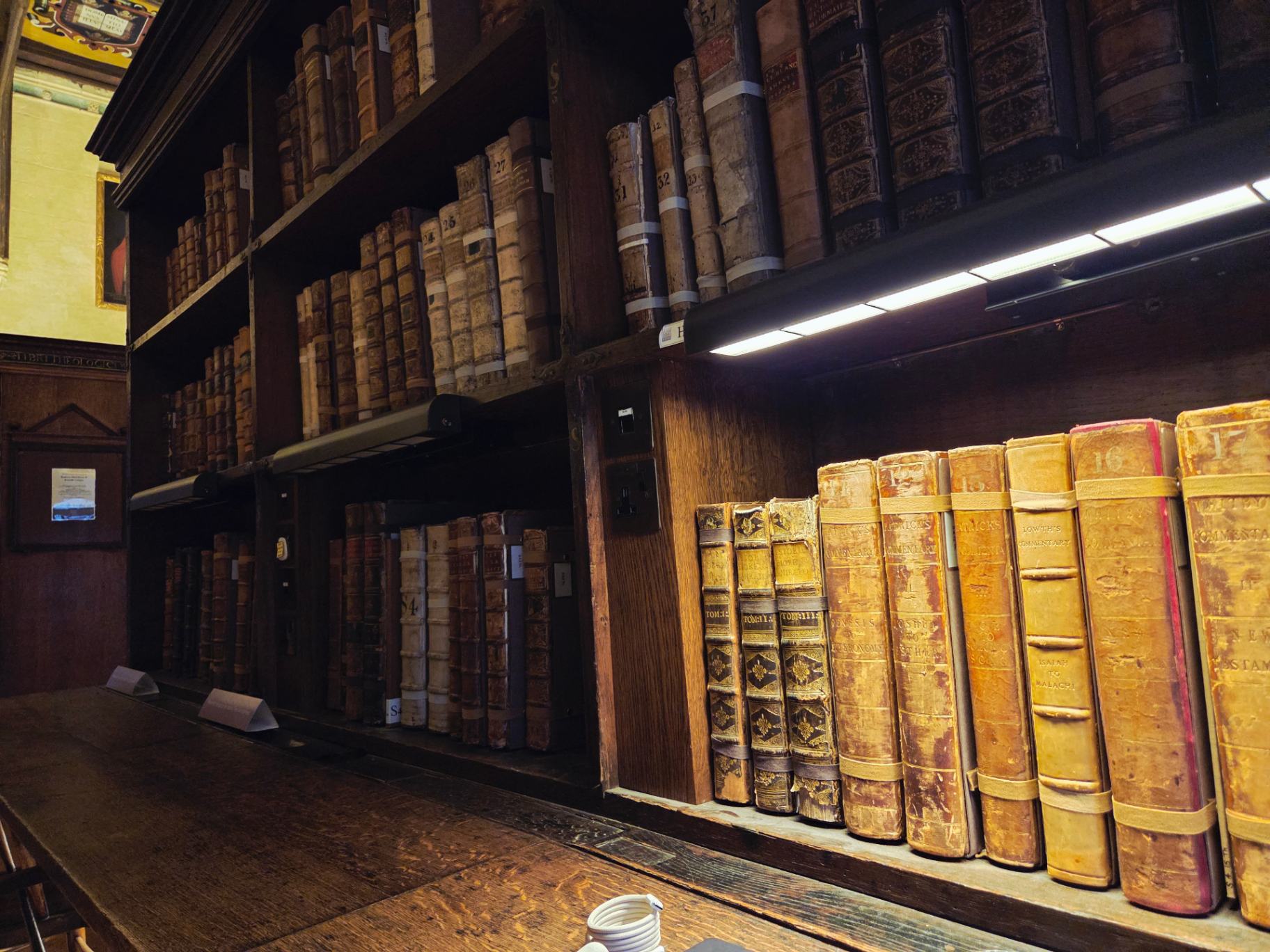 座位前方就是四五百年歲數的書籍,非常古老。我發現這些老書的書脊幾乎都有突起的橫條紋,不知是否與該年代的裝訂方式有關。
