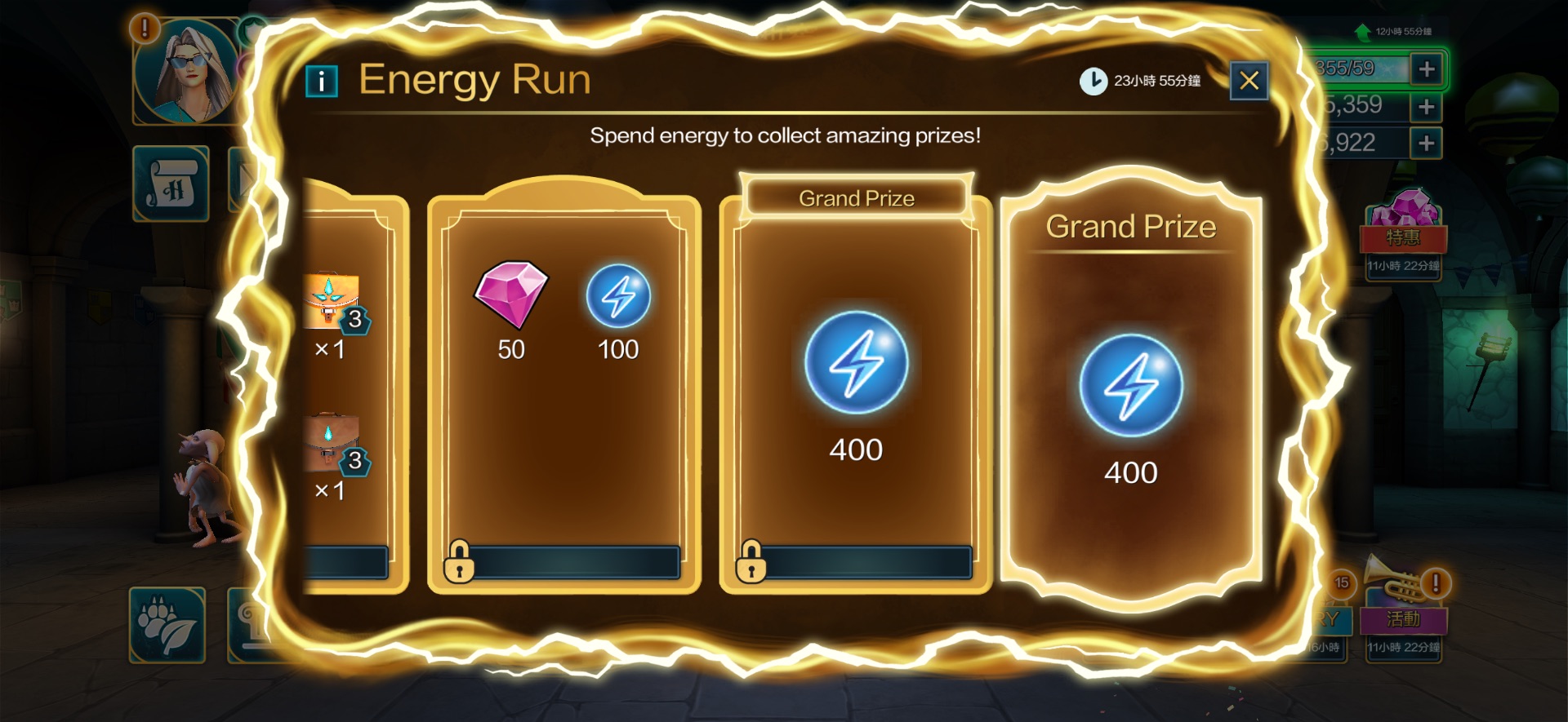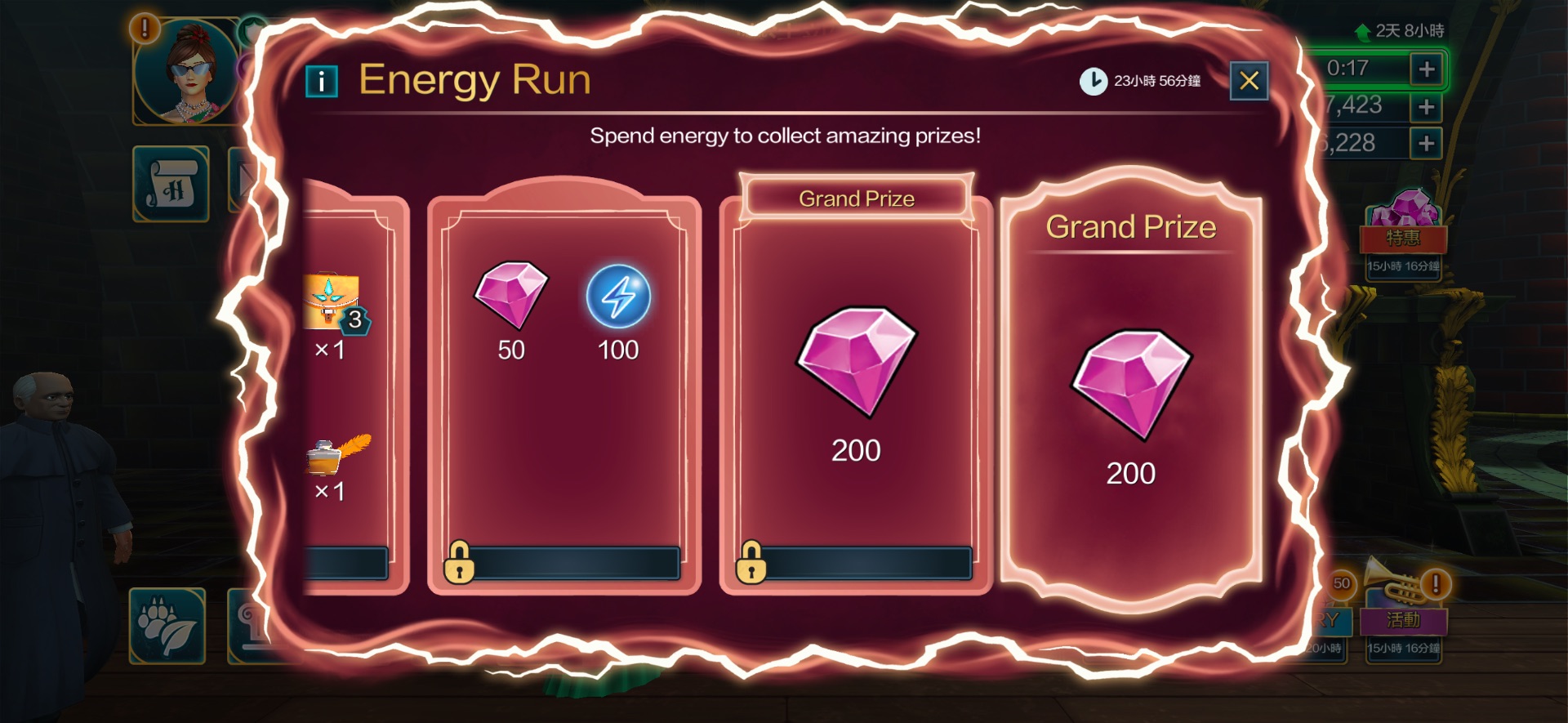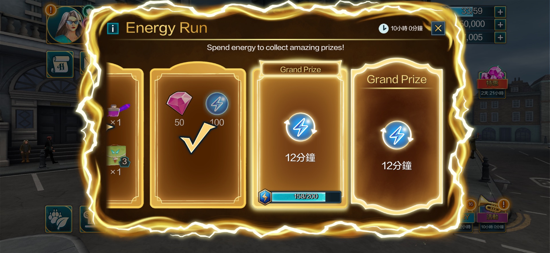 | 20 | 200 | (3)天2分鐘能量/12分鐘無限能量 | 400能量/12分鐘無限能量 | 200鑽 |