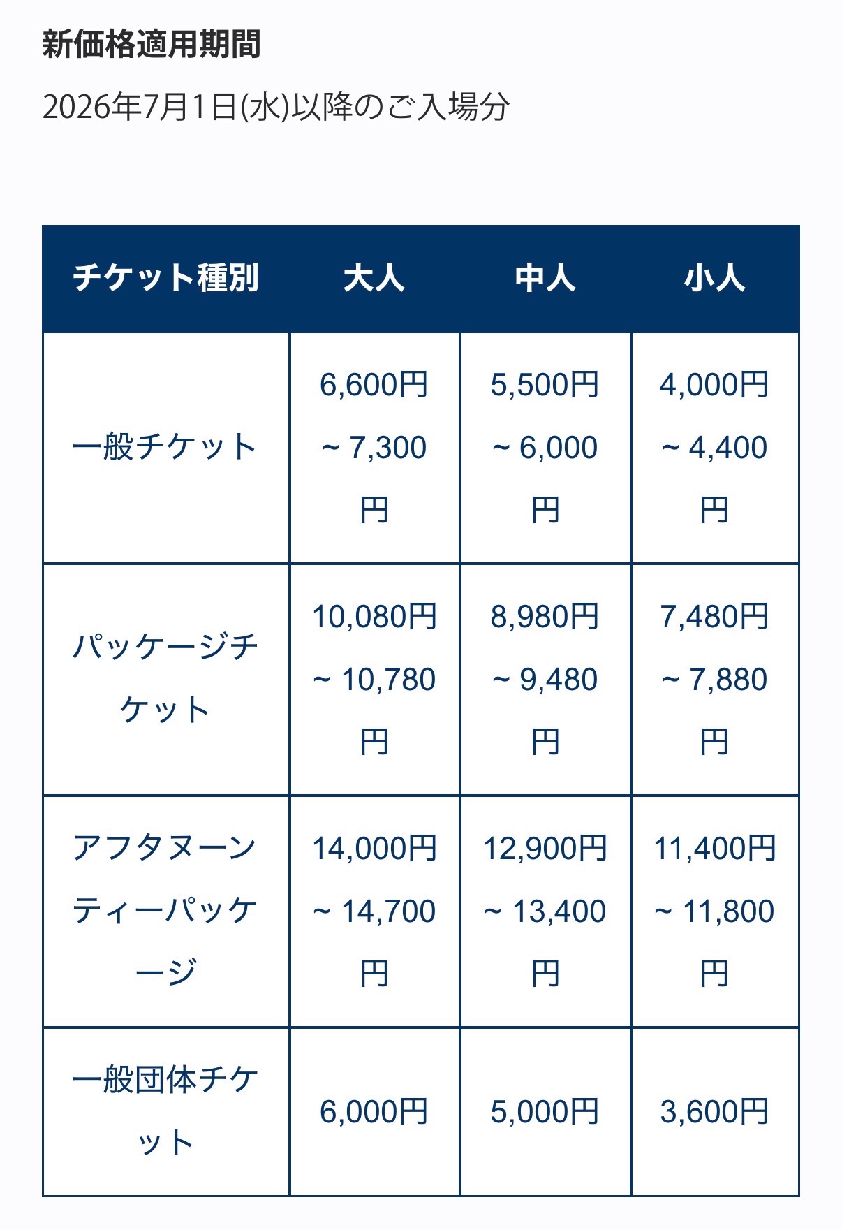 本次將自 2026年7月1日(週三)入場 起,調整門票價格。門票價格會依不同時期而有所變動,關於新的價格,請參閱下方的價格表,或於購票流程畫面中確認。