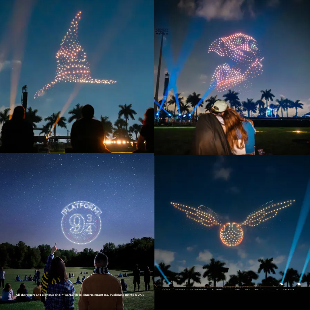 本次演出的最大亮點,在於將多達 1,200 架無人機同步升空,透過精密程式與燈光控制,在夜空中組成《哈利波特》經典角色、場景與象徵圖騰。從霍格華茲城堡輪廓,到標誌性的金探子與角色剪影,這些熟悉畫面將以動態形式浮現在觀眾眼前,帶來不同於傳統煙火或投影的視覺震撼。