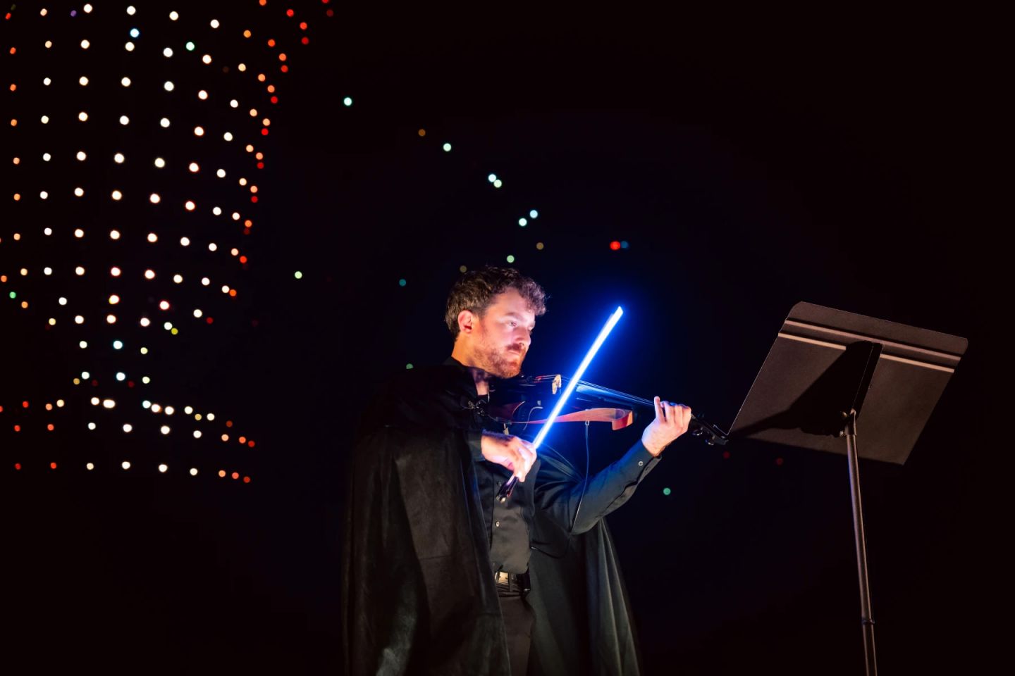 除了空中演出外,整場活動也結合現場音樂與觀眾互動設計。官方透露,現場將由小提琴家進行即時演奏,搭配影像節奏,營造更具沉浸感的魔法氛圍;觀眾入場時還會配發 LED 手環,能隨演出變化同步發光,讓整個觀眾席也成為演出的一部分,打造「台上台下共同施展魔法」的體驗。