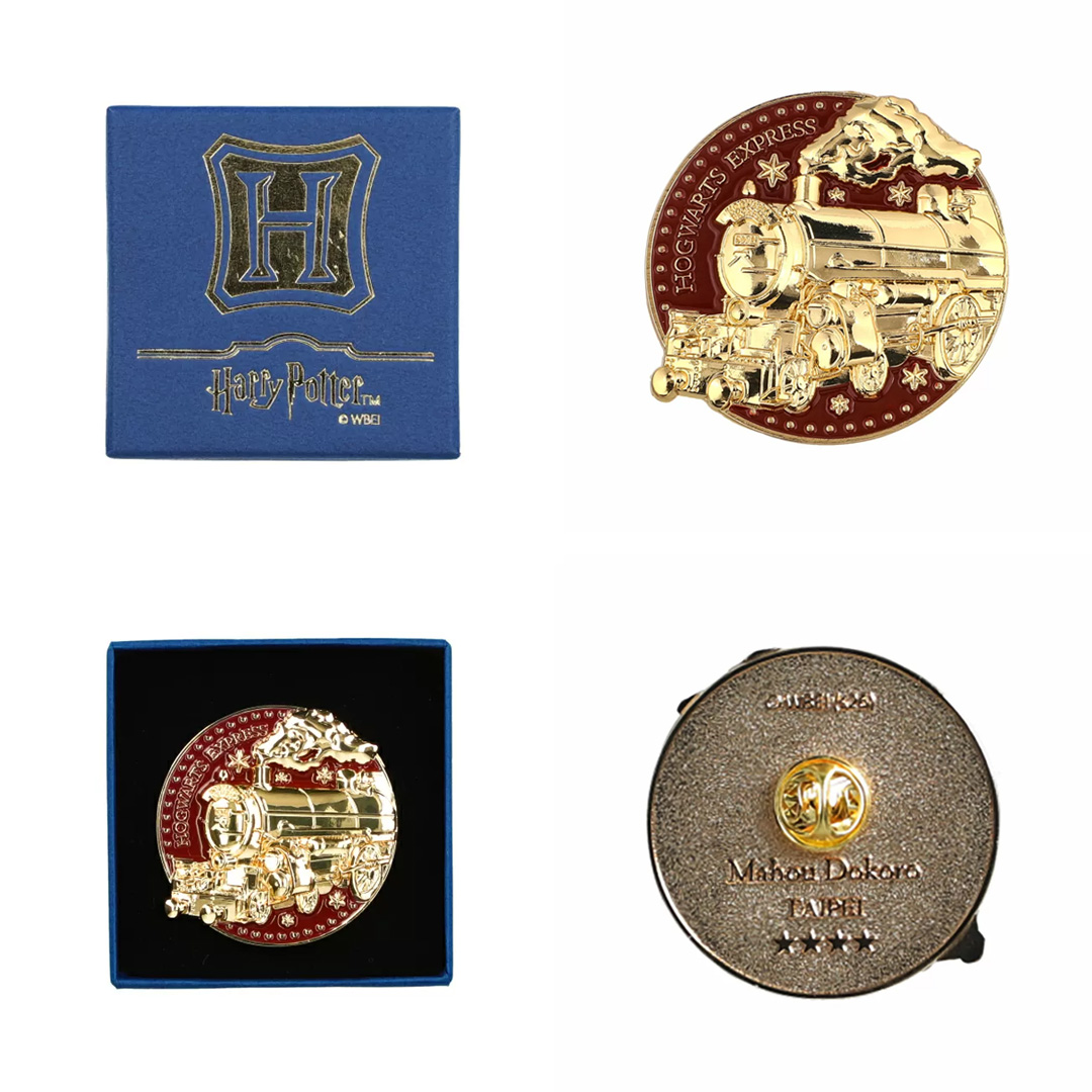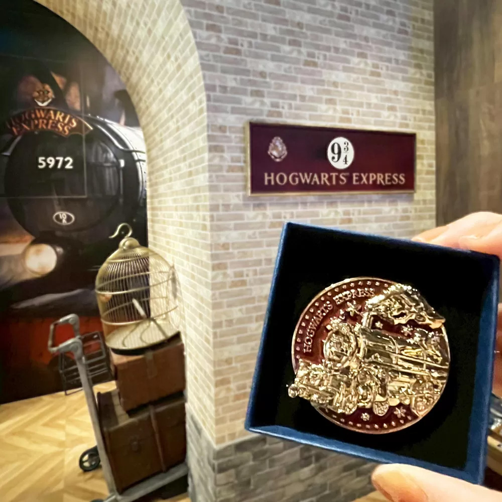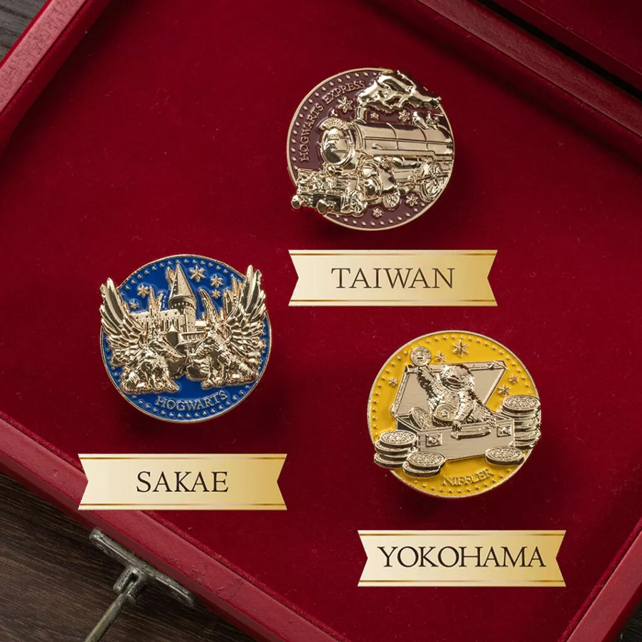 台灣限定的「哈利波特魔法之地」原創硬幣徽章,刻畫出行進中的霍格華茲特快車,以腥紅色背景與金色凸面呈現出高質感;深藍色紙盒與金箔燙印的禮盒包裝,更提升收藏與送禮價值。每個徽章背面都刻印有門市名稱與星號表示的開店順序,因此全球第四間「魔法之地」的台北南港門市,代表性的徽章背面刻有四個星星。